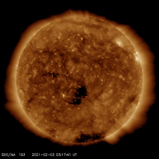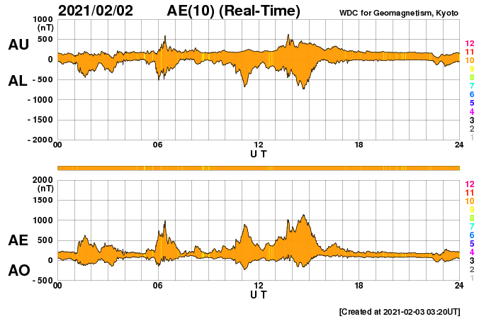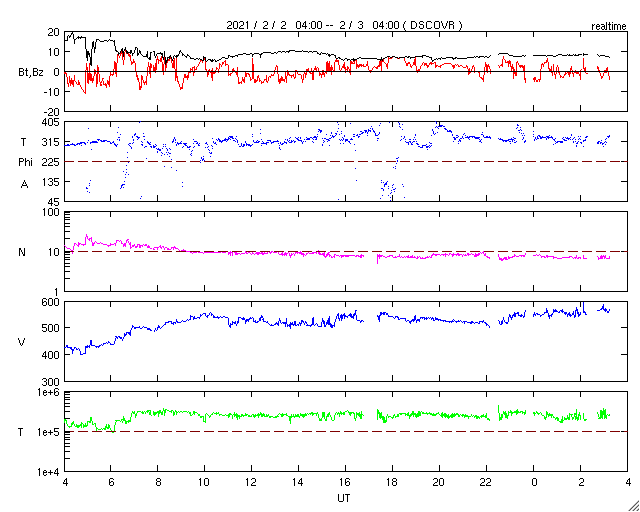 2021/ 2/ 3 12:30 更新 太陽風の速度は550km/秒に高まっています。磁気圏の活動は落ち着いています。 担当 篠原 太陽風は、昨日の午後に500km/秒を超えて高速風になり、 昨夜から今朝まで530km/秒で推移しました。 現在はもう少し上がって、550km/秒になっています。 太陽風の磁場強度は、 昨日のニュースの後に再び15nTに上がりましたが、 夜には一段下がって、 以降は7nT前後とやや強まった状態で推移しています。 速度が高まってきたので、 この後は下がっていくかもしれません。 27日周期の図を見ると、 前周期と同様の太陽風の高まりになっています。 前回は最高速度に達すると(1月6日)、 すぐに速度は下がって行きましたが、 今回はどうなるでしょうか。 今回はコロナホールがよく見えるようになっていたので、 高速風は前回より長く続くかもしれません。 AE指数は、グラフの中盤までは 1000nTに達するような中規模の活動が続いていますが、 以降は静かになっています。 速度は高まっているので、 活動が再び高まる可能性はあります。 SDO衛星AIA193では、 太陽の中央部にコロナホールが見えています。 3日後くらいにこの領域の影響が到来するかもしれません。 太陽は、北西(右上)に見えていた黒点に 2801群と番号が付けられています。 また、更に西の端近くに新しい黒点が発生しています。 X線グラフに変化はなく、太陽は穏やかです。 ![]() SDO衛星のAIA193カメラによる太陽コロナの様子 (c) SDO (NASA) ![]() SDO衛星による太陽の可視光写真。マウスの矢印を写真に重ねると、黒点番号付きの写真に切り替わります。 (c) SDO (NASA) ![]() DSCOVRが観測した太陽風の磁場(1番上の枠、黒線は全体の強度、赤線は南北成分) および、太陽風の密度(3番目の紫線)、速度(4番目の青線) (c) データ:NOAA/SWPC、作図:宇宙天気ニュース ![]() AE指数(速報値) 下段のAEグラフの値が高くなると、オーロラ活動が活発化しています。 (c) 京都大学WDC ![]() ![]() 27日の太陽周期に合わせたデータプロット 太陽が同じ面を地球に向けていた27日前の変化から、今後を予想することができます。 (c) 作図:宇宙天気ニュース