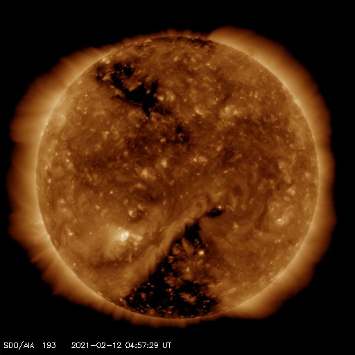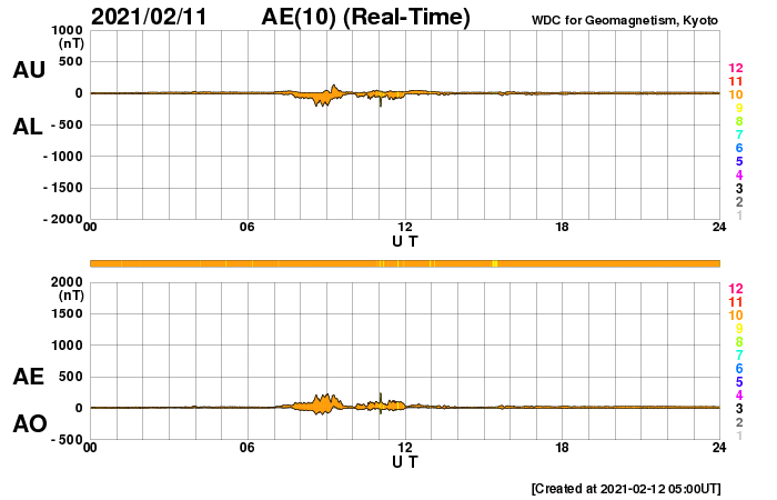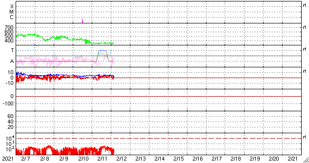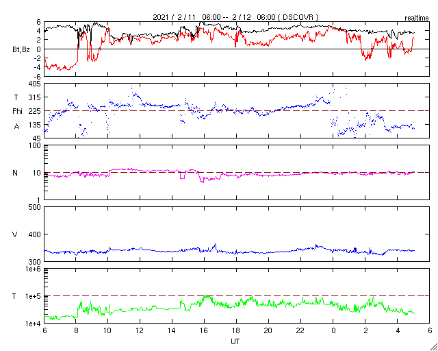 2021/ 2/12 14:11 更新 低速の太陽風が続いています。太陽は無黒点です。 担当 篠原 太陽風は、330km/秒と低速の風が続いています。 磁場強度は、4nT前後と平均的な状態です。 磁場の南北成分は、全体としては北寄りで推移しています。 磁気圏は穏やかで、AE指数はほとんど変化が起きていません。 SDO衛星AIA193では、 南半球のコロナホールは西側に進み、 明後日くらいから影響が始まるかもしれません。 一方、太陽の北東側(左上)にもコロナホールが現れています。 この領域も27日前の前周期に見えていたのですが、 太陽風への影響は特にないままでした。 今回はどうなるでしょうか。 太陽は、昨日見えていた小さい黒点は消えてしまい、 無黒点の状態です。 X線グラフも変化はなく、太陽はとても穏やかです。
