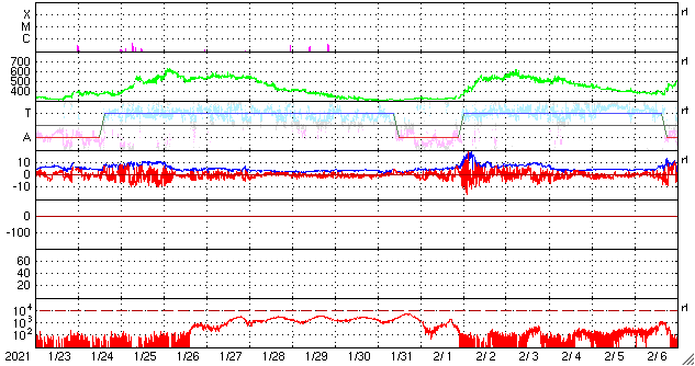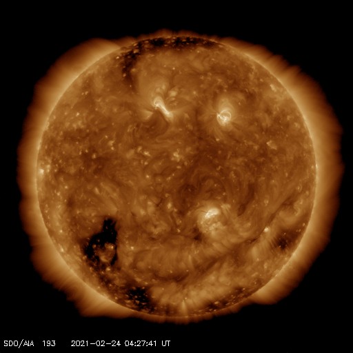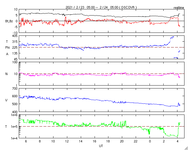 2021/ 2/24 13:41 更新 太陽風の速度は下がり始めています。 担当 篠原 昨夜くらいから太陽風の速度は低下が始まり、 既に470km/秒とやや高速程度に下がっています。 磁場強度も5nTから3nTへ下がっています。 地球は、高速風の領域を通り過ぎようとしている様です。 太陽風のグラフの最後を見ると、 速度や磁場強度に小幅の急な変化が発生しています。 もうしばらく様子を見る必要がありますが、 20日夜のCME(コロナ質量放出)に関係する変化が やって来たのでしょうか。 ここまでの様子だと、小さい変化で終わりそうです。 AE指数は、500nT前後の変化が続いています。 全体としては変化が次第に小さくなっていて、 太陽風速度の低下の影響が現れている様です。 このまま太陽風が穏やかになれば、 磁気圏も穏やかになるでしょう。 SDO衛星AIA193では、 太陽の南東側(左下)にコロナホールが見えています。 次の太陽風の高まりは、この領域の影響となりそうです。 27日周期の図を見ると、 前周期は、2月2日から速度の高まりが始まっています。 太陽は、2804黒点群と2805黒点群が 昨日と同様に見えています。 X線グラフの変化はあまり見られず、 活動は穏やかです。 SDO衛星の可視光写真によると、 2803黒点群に小さい黒点が再び現れている様です。 ![]() SDO衛星のAIA193カメラによる太陽コロナの様子 (c) SDO (NASA) ![]() SDO衛星による太陽の可視光写真。マウスの矢印を写真に重ねると、黒点番号付きの写真に切り替わります。 (c) SDO (NASA) ![]() DSCOVRが観測した太陽風の磁場(1番上の枠、黒線は全体の強度、赤線は南北成分) および、太陽風の密度(3番目の紫線)、速度(4番目の青線) (c) データ:NOAA/SWPC、作図:宇宙天気ニュース ![]() AE指数(速報値) 下段のAEグラフの値が高くなると、オーロラ活動が活発化しています。 (c) 京都大学WDC ![]() ![]() 27日の太陽周期に合わせたデータプロット 太陽が同じ面を地球に向けていた27日前の変化から、今後を予想することができます。 (c) 作図:宇宙天気ニュース