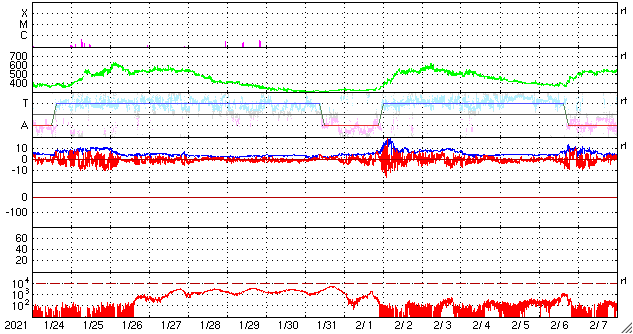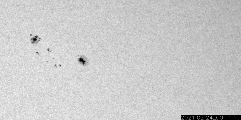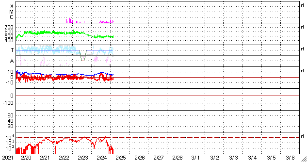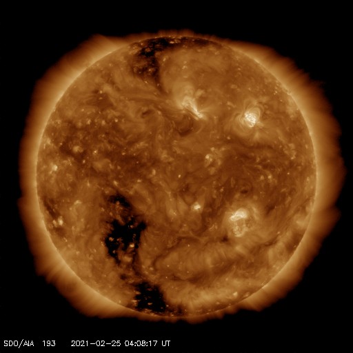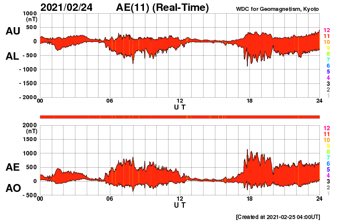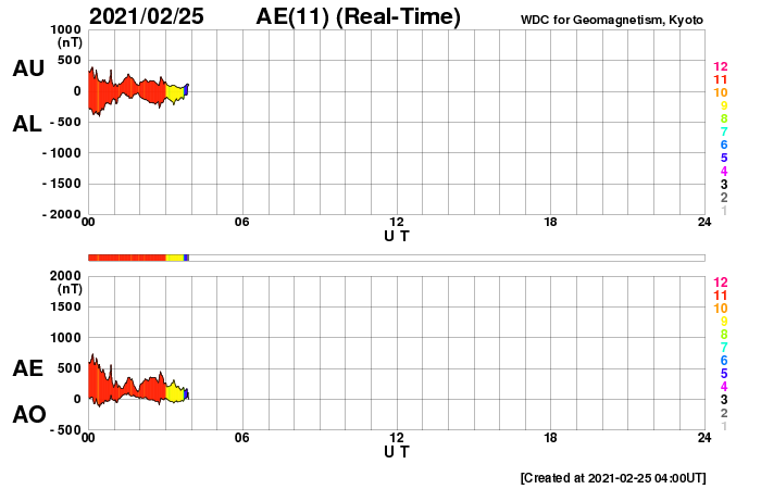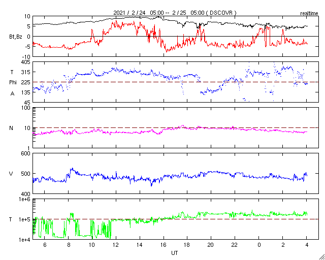 2021/ 2/25 13:16 更新 太陽風はやや高速の状態が続き、磁気圏も活動的です。 担当 篠原 太陽風は、470〜500km/秒の間を上下していて、 やや高速の状態です。 磁場強度は、5nTから9nTにやや強まり、 再び4nTに下がっています。 磁場の南北成分は、 -5nTと5nTの間をゆっくりと変化しています。 南を向いた頃に磁気圏の活動が強まって、 AE指数は、500〜1000nTの中規模の変化が、 続いたり、止まったりしています。 昨夜は、イエローナイフのライブカメラで、 きれいなオーロラを見ることができました。 27日周期の図を見ると、 前周期の太陽風は、高速風が終わった頃です。 今回もそろそろ速度が下がるのではないでしょうか。 そしてSDO衛星AIA193では、 次のコロナホールが太陽の南側に見えています。 明日くらいに中央線に達して、 その3日後くらいから高速太陽風が始まるかもしれません。 27日周期の図では、 前周期は2月2日から速度が高まっています。 今回も同じ様なタイミングかもしれません。 太陽では、北西の2804黒点群が大きくなっています。 昨日からの発達の様子を、SDO衛星の動画で紹介します。 黒点の動きが目立っています。 また、中央部の南側に小さい黒点が現れています。 SDO衛星AIA193で、明るく光っている位置です。 また、2803群だった場所にも、 とても小さい黒点が見えている様です。 X線グラフは、全体の強度は少し上がっていますが、 フレアは、Bクラスの小さい活動が見られる程度です。