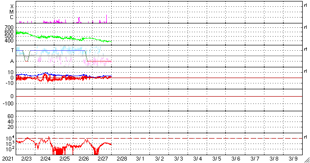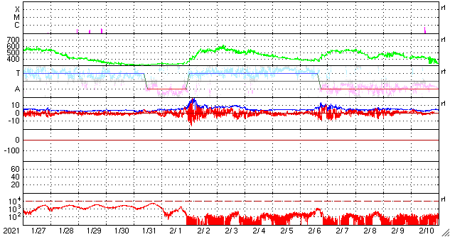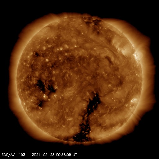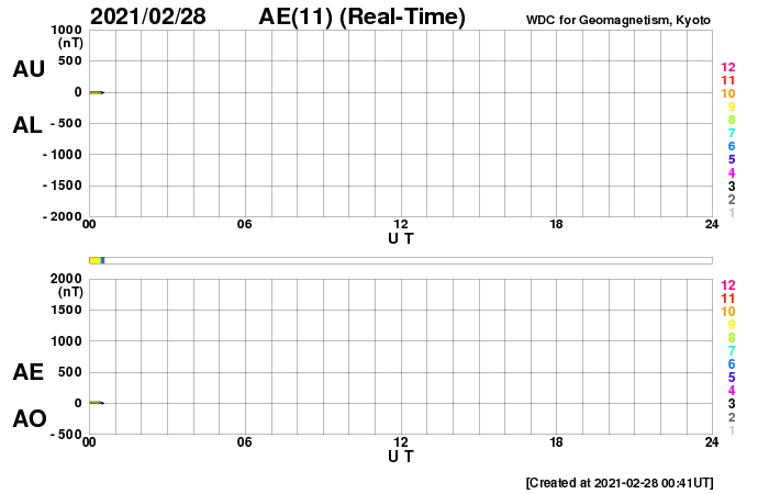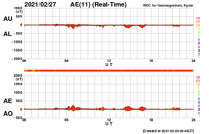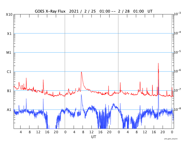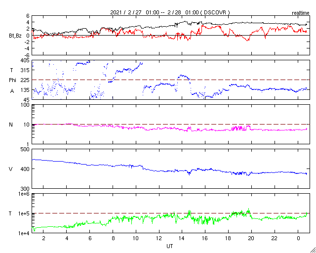 2021/ 2/28 09:53 更新 C2.7の小規模フレアが発生しました。太陽風はやや低速です。 担当 篠原 今日未明、28日3時(世界時27日18時)に、 太陽の北西端(右上)近くの2804黒点群で C2.7の小規模フレアが発生しました。 C2に達するフレアの発生は、 昨年、12月14日のC4.0以来で、2か月半ぶりです。 これ以降は、1月19〜20日に、C1.0とC1.4が起きた程度で、 太陽は穏やかな状態が続いていました。 2804群は、この後すぐに西の端に沈んでしまいます。 太陽は静かな状態に戻りそうです。 太陽風の速度は、昨夜に400km/秒台を割り、 380km/秒とやや低速になっています。 磁場強度は、3nTとやや弱い状態です。 磁場の南北成分は、比較的北寄りになっています。 磁気圏は穏やかで、 AE指数は小さい変化が時々見られる程度です。 SDO衛星AIA193では、 南半球のコロナホールが太陽の西側に進んでいます。 明後日くらいからこの領域の影響が始まりそうです。 ![]() SDO衛星のAIA193カメラによる太陽コロナの様子 (c) SDO (NASA) ![]() SDO衛星による太陽の可視光写真。マウスの矢印を写真に重ねると、黒点番号付きの写真に切り替わります。 (c) SDO (NASA) ![]() GOES衛星の太陽X線強度。赤・橙 = 0.1〜0.8 nm、青・紫 = 0.05〜0.4 nm (c) データ:NOAA/SWPC、作図:宇宙天気ニュース ![]() DSCOVRが観測した太陽風の磁場(1番上の枠、黒線は全体の強度、赤線は南北成分) および、太陽風の密度(3番目の紫線)、速度(4番目の青線) (c) データ:NOAA/SWPC、作図:宇宙天気ニュース ![]() AE指数(速報値) 下段のAEグラフの値が高くなると、オーロラ活動が活発化しています。 (c) 京都大学WDC ![]() ![]() 27日の太陽周期に合わせたデータプロット 太陽が同じ面を地球に向けていた27日前の変化から、今後を予想することができます。 (c) 作図:宇宙天気ニュース