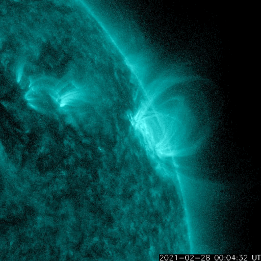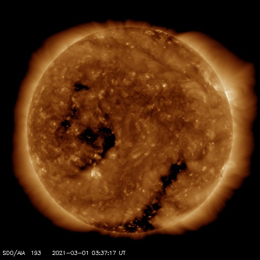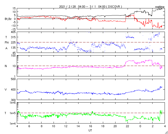 2021/ 3/ 1 12:47 更新 太陽風磁場が南向きに大きく変化して、磁気圏活動が強まりそうです。C3.9の小規模フレアが発生しました。 担当 篠原 今朝から太陽風に変化が発生しています。 磁場強度は、3nTから15nTへ大きく強まり、 速度は、360km/秒から400km/秒と、 小幅の変化ですが、平均的な速度に上昇しています。 SDO衛星AIA193で注目していた コロナホールの影響が始まったのでしょうか。 27日周期の図を見ると、 前周期の太陽風も 同じ頃から磁場強度や速度の高まりが始まっています。 磁場強度が強まった後、 南北成分は南向きに大きく変化していて、 現在は -14nTに達しています。 この影響で磁気圏の活動が強まりそうです。 AE指数は500nTの中規模の変化が発生していますが、 活動は更に活発になるかもしれません。 SDO衛星AIA193では、 東側(左側)の赤道付近にもコロナホールが見えています。 この領域の影響は、 27日周期の図の2月6日に始まる高速太陽風の回帰です。 太陽では、2804黒点群が北西の端(右上)に沈んで 見えなくなっています。 この領域で、昨日午後、2月28日15時半(世界時28日6時半)に、 C3.9の小規模フレアが発生しています。 SDO衛星AIA131による動画を掲載します。 一方、太陽の中央部南東寄り(左下)に、 今日未明から新しい黒点が出現しています。 今のところ、特に活動は見られません。 ![]() 2804黒点群で発生したC3.9の小規模フレア。SDO衛星AIA131。 (c) SDO (NASA)、(動画加工 : 宇宙天気ニュース) ![]() SDO衛星のAIA193カメラによる太陽コロナの様子 (c) SDO (NASA) ![]() SDO衛星による太陽の可視光写真。マウスの矢印を写真に重ねると、黒点番号付きの写真に切り替わります。 (c) SDO (NASA) ![]() DSCOVRが観測した太陽風の磁場(1番上の枠、黒線は全体の強度、赤線は南北成分) および、太陽風の密度(3番目の紫線)、速度(4番目の青線) (c) データ:NOAA/SWPC、作図:宇宙天気ニュース ![]() AE指数(速報値) 下段のAEグラフの値が高くなると、オーロラ活動が活発化しています。 (c) 京都大学WDC ![]() ![]() 27日の太陽周期に合わせたデータプロット 太陽が同じ面を地球に向けていた27日前の変化から、今後を予想することができます。 (c) 作図:宇宙天気ニュース