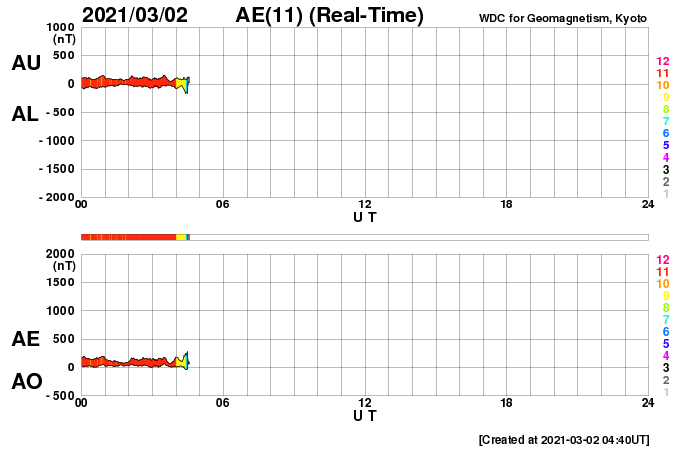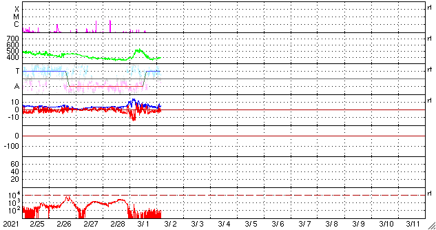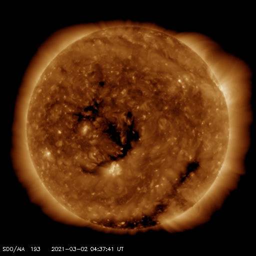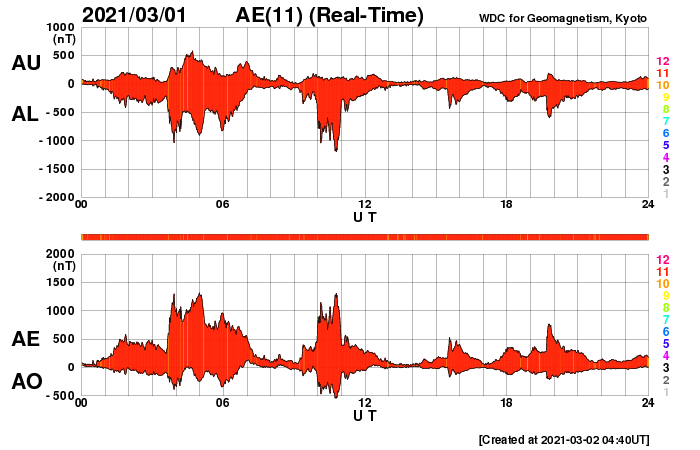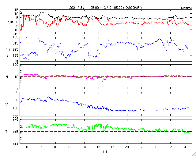 2021/ 3/ 2 13:50 更新 太陽風は一時的に高速風になり、磁気圏の活動も活発になりました。 担当 篠原 昨日のニュースの直後、 太陽風の速度は500km/秒に高まりました。 15nTに達していた磁場強度の強まりは、 この頃から下がり始め、 夜には5nTと平均的な状態に戻っています。 速度の高まりは短い時間で終わりを迎えていて、 今日に入る頃には400km/秒台を割り、 以降、370km/秒とやや低速の風が続いて、 グラフの最後で400km/秒に少し上がっています。 太陽風磁場の南向きの強まりは、 速度が高まった頃に終わりましたが、 以降も弱い南寄りになっています。 磁気圏の活動は、 昨日の昼から夜にかけて、 AE指数で1300nTに達する大きな変化が見られ、 以降は、小規模の変化に留まっています。 27日周期の図を見ると、 太陽風速度の高まりは、 前周期よりもかなり短時間になっています。 太陽の西に通り過ぎていったコロナホールの影響は これで終わりなのでしょうか。 SDO衛星AIA193では、 太陽の中央部にコロナホールが見えています。 3日後くらいからこの領域の影響が始まりそうです。 太陽は、昨日現れた黒点が中央部の南側に見えています。 群番号は付けられていません。 X線グラフは、2804群が沈んで変化がなくなり、 穏やかになっています。