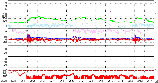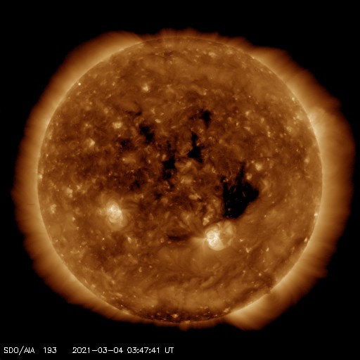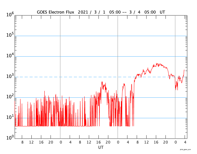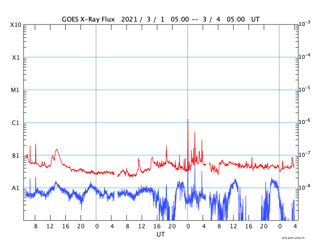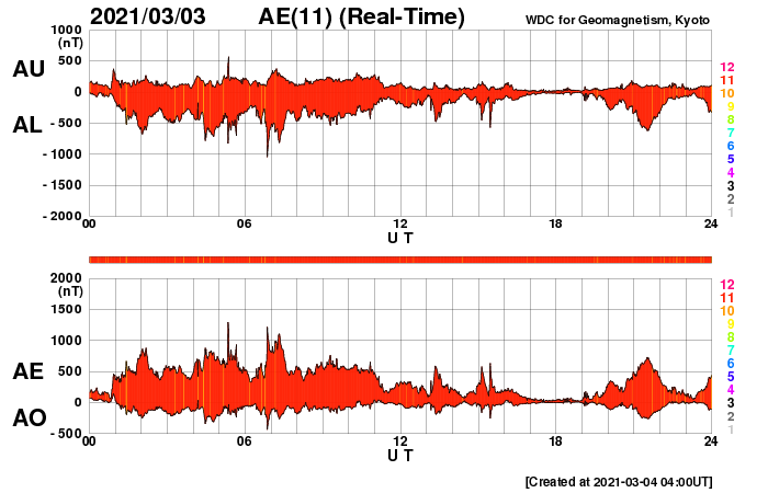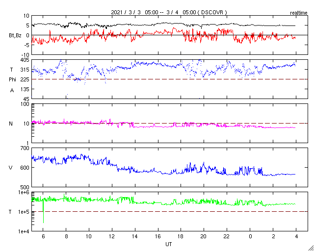 2021/ 3/ 4 13:04 更新 高速の太陽風が続いています。磁気圏の活動は少し落ち着いています。 担当 篠原 太陽風は高速の状態が続いています。 速度は、昨夜遅くまで650km/秒前後を保ちましたが、 今日に入る頃に600km/秒台を割り、 以降は570km/秒付近で安定しています。 磁場強度は、5nTと平均的な状態が続いています。 磁場の南北成分は、 昨日よりも南向きの変化が少なくなっています。 このため、AE指数の変化は、 初めの頃は500〜1000nTの活動が連続していますが、 中盤以降は、500nTの変化が時々発生する程度になっています。 少し落ち着いてしまいましたが、 高速風が続いているので、 引き続きオーロラの活動に注目してください。 SDO衛星AIA193では、 太陽中央部のコロナホールが西に進んでいます。 太陽風の高まりは、 このままこちらの影響に切り替わりそうです。 太陽風が強まった影響で、 放射線帯の高エネルギー電子が増加しています。 明日には10000の線に達しているかもしれません。 太陽の2806、2807黒点群は、 特に規模の変化はありません。 X線グラフの変化はなくなっていて、 活動は落ち着いています。