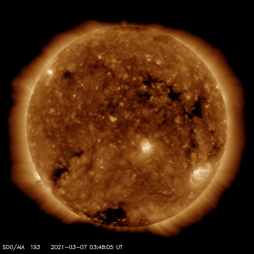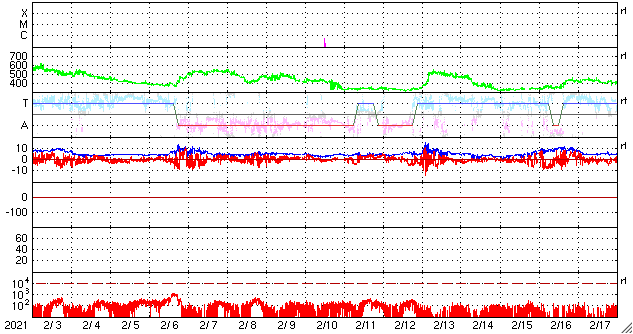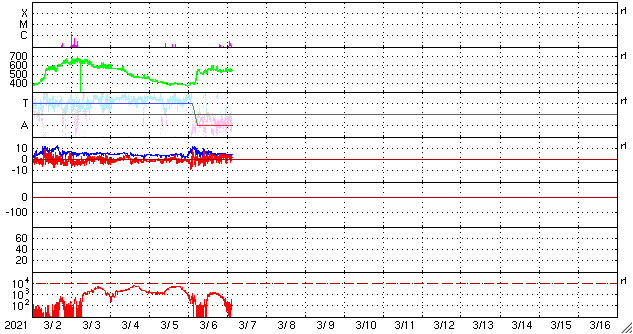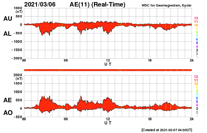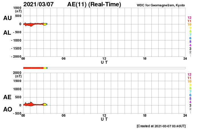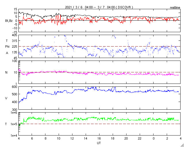 2021/ 3/ 7 12:58 更新 550km/秒の高速太陽風が到来しています。2806黒点群が再び現れています。 担当 篠原 昨日のニュースの直後から太陽風の速度は上昇を始めて、 一気に550km/秒へ高まり、 現在まで高速の状態が続いています。 反対に、10nTに強まっていた磁場強度は5nTへ下がり、 平均的な値に戻っています。 磁場の南北成分は、弱い北寄りの傾向になっています。 このため、速度は上昇しましたが、 磁気圏の活動はあまり高まらず、 AE指数は、300〜600nTの中規模の変化が 時々発生している程度です。 磁場強度はグラフの最後では4nTに下がっています。 この後、南北成分が南寄りに変わった場合でも、 磁気圏の活動の高まりは限定的になりそうです。 27日周期の図を見ると、 前周期の高速風は3日ほど続いています。 今回はどのくらいになるでしょうか。 太陽では、南西に進んでいた2806黒点群の領域に 再び黒点が出現しています。 X線グラフは、 Bクラスの小さいフレアが発生するようになっています。 この後の活動規模の推移に注目して下さい。