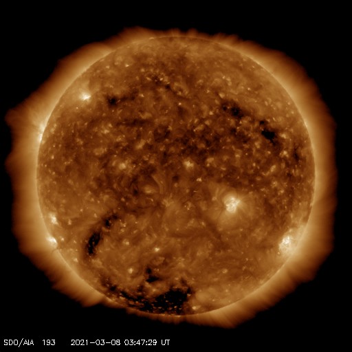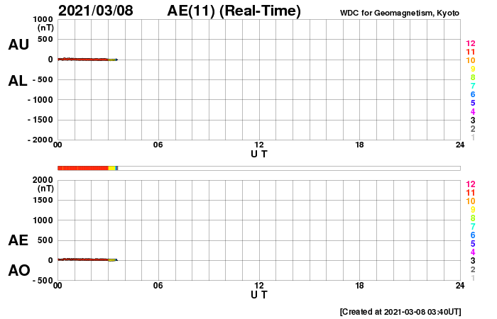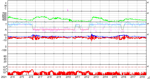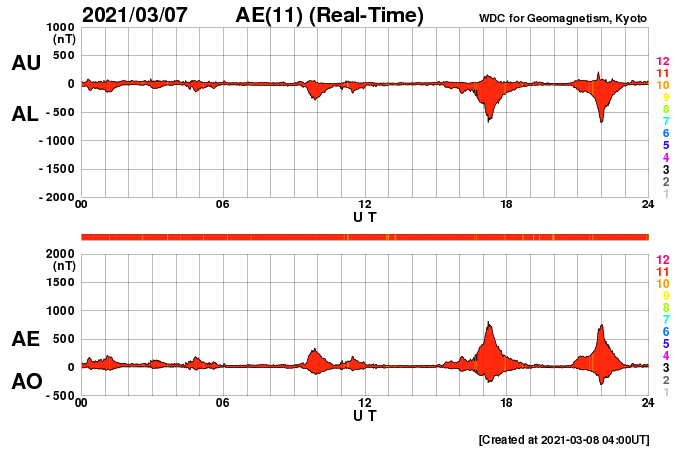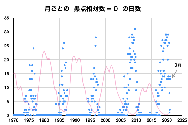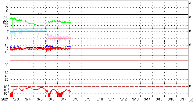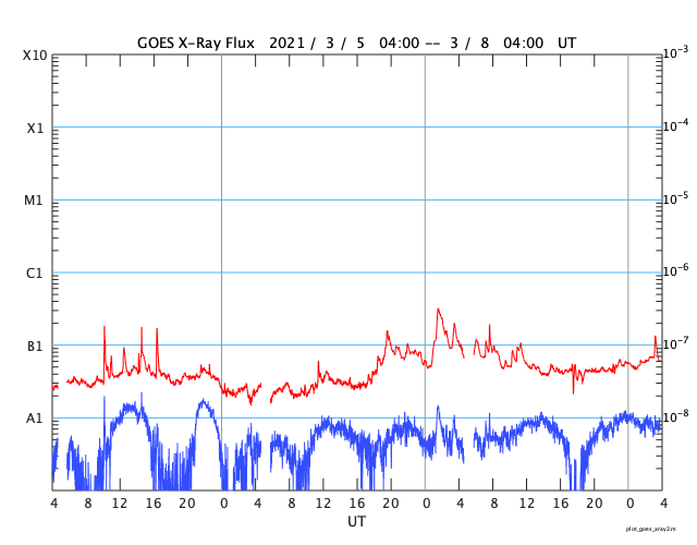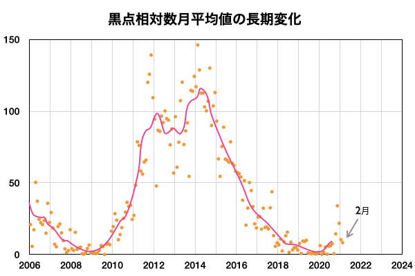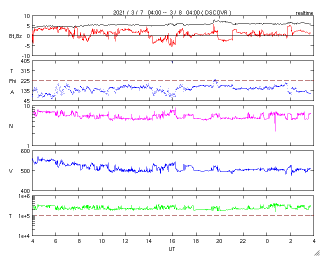 2021/ 3/ 8 12:58 更新 高速の太陽風が続いています。2月の黒点相対数は 8.3 でした。 担当 篠原 WDC-SILSOより、2月の黒点相対数の月平均値は 8.3 と発表されました。 昨年9月の0.6以来の1桁台です。 1月は10.4でしたので、グラフの点は横並びになっています。 無黒点の日は13日で、こちらも1月の14日と同じくらいです。 ただし、2月も黒点が少なかったのは中盤までで、 18日以降は無黒点の日はなく、 3月に入ってもSILSOの速報値では7日までに無黒点の日はありません。 まだ先の事ですが、次回の3月のデータでは、 黒点数は上昇に向かうのではないでしょうか。 現在の太陽は、 中央部にあった2807群は見えなくなっています。 南西(右下)の2806群は太陽の端に近づいていて、 この後見えなくなりそうです。 一方、北西(左上)の領域に とても小さい黒点が現れている様です。 X線グラフに特に変化はなく、活動は穏やかです。 SDO衛星AIA193では、 東端(左端)近くに明るい領域がいくつか見えています。 これらに黒点は現れるでしょうか。 太陽風は、速度が500km/秒に下がり、 高速の状態は続いていますが、勢いは弱くなってきました。 磁場強度は、5〜6nTと平均的な状態です。 磁場の南北成分は、0nTか弱い北寄りですが、 時々、南向きに変化しています。 このため、AE指数も時々活動が強まって、 700nTに達する中規模の変化が2回発生しています。 27日周期の図を見ると、 前周期の太陽風はもう1日程度速度の高まりが続いています。 今回はどこまで続くでしょうか。