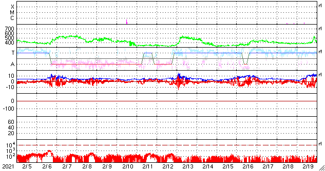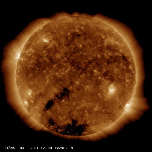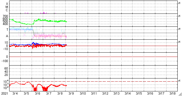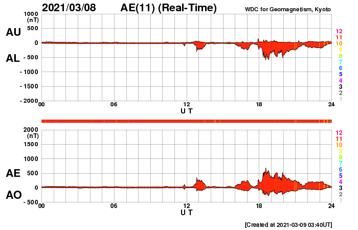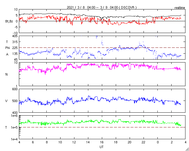 2021/ 3/ 9 12:38 更新 高速の太陽風が続いていますが、速度は下がっていくかもしれません。 担当 篠原 太陽風は、500km/秒と高速の状態が続いています。 磁場強度は、6nTから4nTに少し下がっています。 高速の太陽風は、4日目に入っています。 前周期の高速太陽風がこのくらいで終わっているので、 この後、速度は低下に向かうかもしれません。 (グラフの最後で下がり始めている様にも見えます) 太陽風磁場の南北成分は、 北を向いたり、南を向いたり、ゆっくり変化しています。 AE指数では、磁場が南向きになった頃に、 500nTの中規模の変化が発生しています。 現在は北向きなので、AE指数も変化がなくなっています。 27日周期の図を見ると、 前周期の2月13日に速度の高まりが発生しています。 これは、SDO衛星AIA193の南半球側に見えていた コロナホールが影響していた様なのですが、 今回、コロナホールの広がりは小さくなっている様です。 太陽風速度の様子も変わる可能性があります。 太陽は、2806黒点群が西の端に近づいて、 沈もうとしています。 一方、南西部の2807群の場所に小さい黒点が現れています。 X線グラフに変化はなく、太陽は穏やかです。