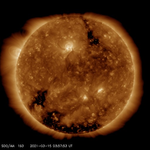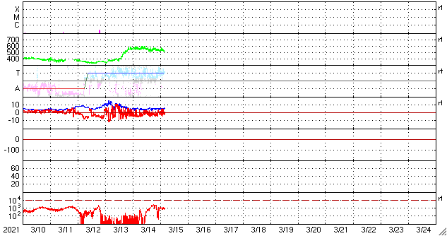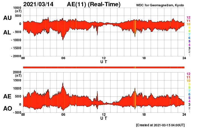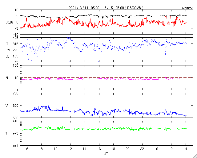 2021/ 3/15 13:14 更新 高速の太陽風が続き、磁気圏の活動も続きました。 担当 篠原 太陽風は、速度が550km/秒から520km/秒へ ゆっくりと下がっていますが、 高速の状態が続いています。 磁場強度は5nTと平均的な値で安定しています。 磁場の南北成分は、図の中盤までは南寄りが続きました。 磁気圏の活動も高まって。 AE指数は500〜1000nTの中規模の変化が続いています (1300nTの大きな変化も起きています)。 ただし、太陽風の図の最後で 南北成分は0nT付近で変化する様になっています。 このため、AE指数も最後は変化が小さくなっています。 磁場の振れ方がこのままになるのか、再び南寄りに変わるのか、 それによって磁気圏の様子も変わってきます。 SDO衛星AIA193では、 北半球のコロナホールが西側に進み、 南半球では南東側にコロナホールが大きく広がっています。 南東側の領域は前周期にも太陽風に影響を及ぼしていて、 27日周期の図は、2月20日から高速の風になっています。 今回も同じタイミングと考えると、3月19日頃になりますが、 コロナホールの広がりはどうでしょうか。 太陽は、南西(右下)の2809群の左側に 新しい黒点が現れています。 一方、北半球の2808群はかなり小さくなっています。 X線グラフは変化がなく、太陽は穏やかです。 ![]() SDO衛星のAIA193カメラによる太陽コロナの様子 (c) SDO (NASA) ![]() SDO衛星による太陽の可視光写真。マウスの矢印を写真に重ねると、黒点番号付きの写真に切り替わります。 (c) SDO (NASA) ![]() DSCOVRが観測した太陽風の磁場(1番上の枠、黒線は全体の強度、赤線は南北成分) および、太陽風の密度(3番目の紫線)、速度(4番目の青線) (c) データ:NOAA/SWPC、作図:宇宙天気ニュース ![]() AE指数(速報値) 下段のAEグラフの値が高くなると、オーロラ活動が活発化しています。 (c) 京都大学WDC ![]() ![]() 27日の太陽周期に合わせたデータプロット 太陽が同じ面を地球に向けていた27日前の変化から、今後を予想することができます。 (c) 作図:宇宙天気ニュース