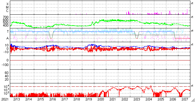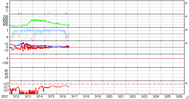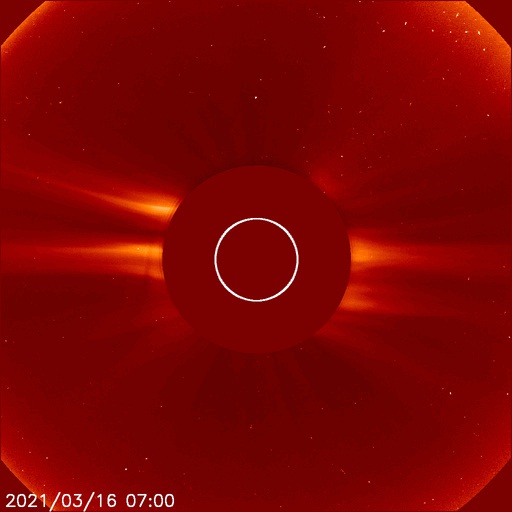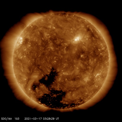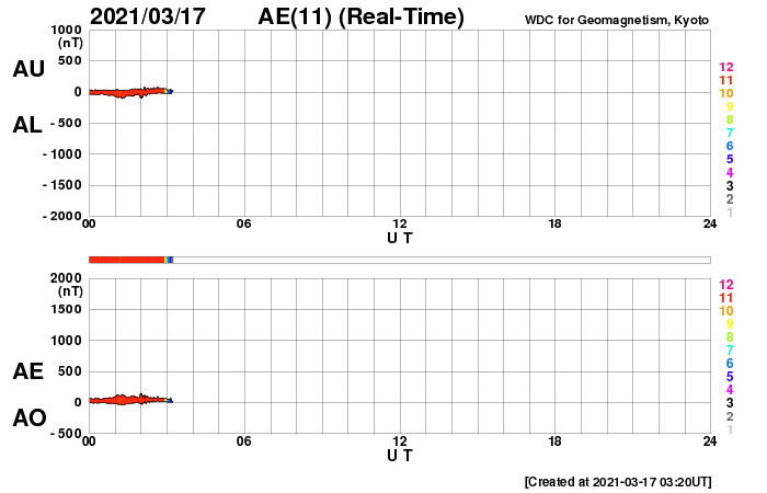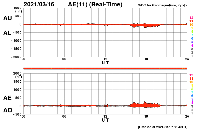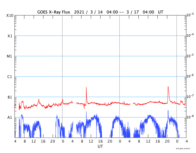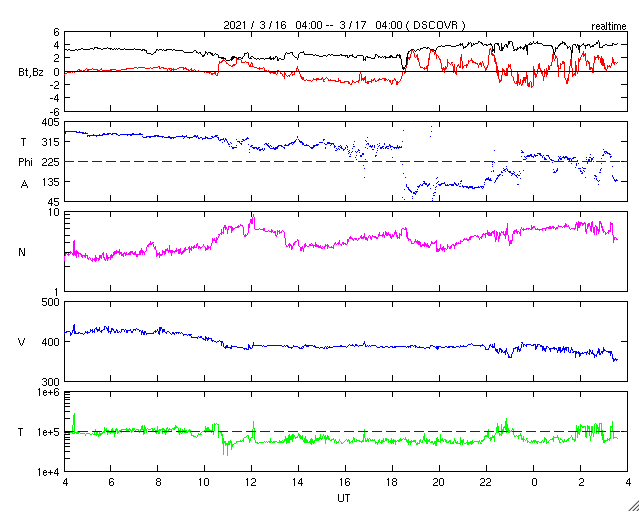 2021/ 3/17 12:44 更新 太陽風は低速になっています。磁気圏も穏やかです。 担当 篠原 昨夜、太陽の南側でCME(コロナ質量放出)が発生しています。 SOHO衛星LASCO C2による動画を掲載します。 この動画だけでは太陽のどちら側で発生したか分からないので、 太陽を左斜めから観測しているSTEREO Ahead衛星の COR2の動画を後半に繋げています。 こちらでは太陽の左側に噴出しているので、 地球とは反対側の現象と考えられます。 従って、地球への影響はありません。 太陽は、北東の端から現れた黒点に 2810群と番号が付けられています。 一方、中央部の2808群の黒点は、 ほとんど分からなくなっています。 X線グラフは、B3.2の小さいフレアが1回発生しているだけで、 太陽は穏やかです。 このフレアは、2808群で発生しています。 太陽風は、昨夜には400km/秒台を割り、 現在は370km/秒と低速の状態です。 磁場強度は4nTと平均的な値になっています。 磁気圏も穏やかで、 AE指数は、小さい変化が1回起きているだけです。 SDO衛星AIA193では、 南半球のコロナホールが太陽の中心線に達しています。 3日後くらいから太陽風の速度が高まりそうです。 27日周期の図を参考にすると、 明後日から始まるかもしれません。