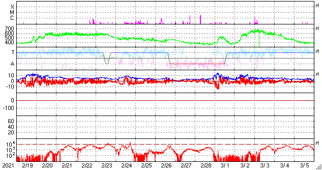 (c) SDO (NASA)、(動画加工 : 宇宙天気ニュース) ![]() フィラメント噴出によるCMEの噴出。SOHO衛星LASCO C2、C3。 (c) SOHO (ESA & NASA)、 (動画加工 : 宇宙天気ニュース) ![]() 太陽を斜めから観測しているSTEREO Ahead衛星COR2によるフィラメント噴出。 (c) STEREO (NASA)、 (動画加工 : 宇宙天気ニュース) ![]() SDO衛星のAIA193カメラによる太陽コロナの様子 (c) SDO (NASA) ![]() SDO衛星による太陽の可視光写真。マウスの矢印を写真に重ねると、黒点番号付きの写真に切り替わります。 (c) SDO (NASA) ![]() GOES衛星の太陽X線強度。赤・橙 = 0.1〜0.8 nm、青・紫 = 0.05〜0.4 nm (c) データ:NOAA/SWPC、作図:宇宙天気ニュース ![]() DSCOVRが観測した太陽風の磁場(1番上の枠、黒線は全体の強度、赤線は南北成分) および、太陽風の密度(3番目の紫線)、速度(4番目の青線) (c) データ:NOAA/SWPC、作図:宇宙天気ニュース ![]() AE指数(速報値) 下段のAEグラフの値が高くなると、オーロラ活動が活発化しています。 (c) 京都大学WDC ![]() ![]() 27日の太陽周期に合わせたデータプロット 太陽が同じ面を地球に向けていた27日前の変化から、今後を予想することができます。 (c) 作図:宇宙天気ニュース