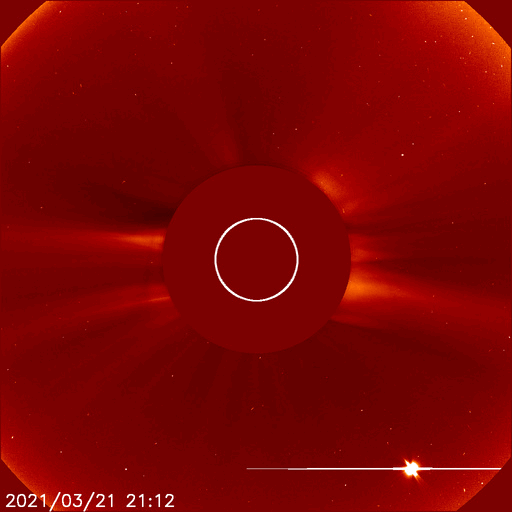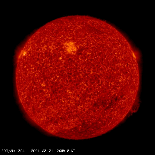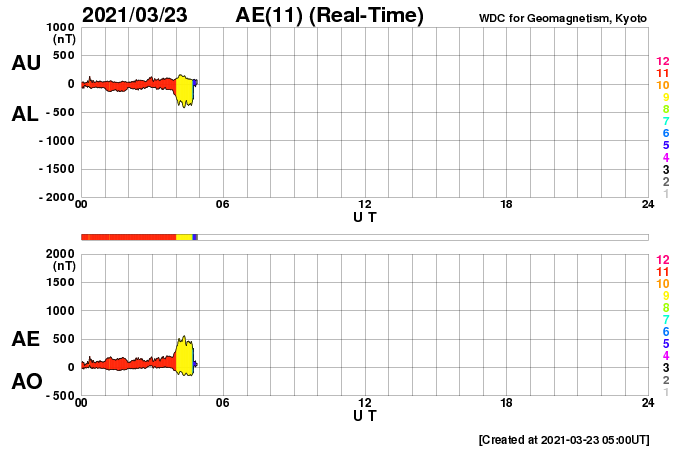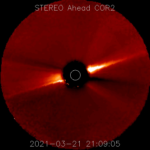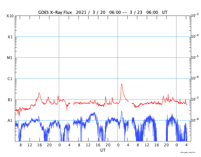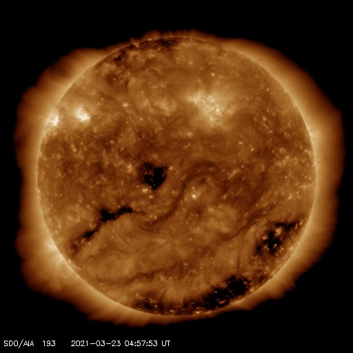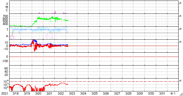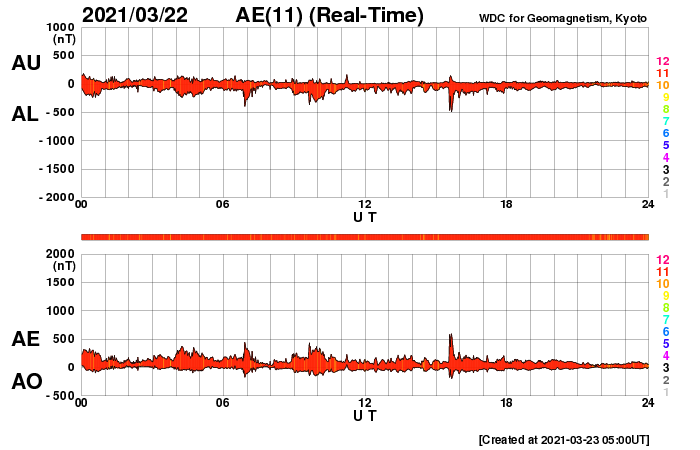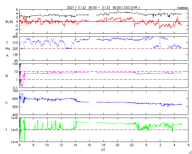 2021/ 3/23 14:11 更新 太陽でフィラメント噴出が発生しています。太陽風は高速ですが、速度は下がり始めています。 担当 篠原 == お詫びと訂正 == 当初のニュースでは、 フィラメント噴出の発生を「今朝早く」と書いていましたが、これは誤りで、 正しくは、このニュースの前日にあたる22日早朝の発生です。 たいへん申し訳ありません。 前日にSDO衛星のWebページが停止していたので、 その期間の画像を確認している間に、日付が混乱してしまった様です。 以下の記事では該当する部分を訂正しています。 ========== 昨日の朝、22日4時(世界時21日19時)頃に、 太陽中央部の北半球側の高緯度寄りで フィラメント噴出が発生しました。 SDO衛星AIA304の動画を掲載します。 やや見にくいですが、薄暗く見えるコロナのガスが 太陽からゆっくりと飛び出しています。 太陽の中心線付近で発生しているので、 地球の方向に向かっている可能性があります。 SOHO衛星のLASCO C2、C3では、 太陽の右上と左下にやや濃く、 CME(コロナ質量放出)のガスが飛び出しています。 地球方向に向かっているため、 ガスの見え方が淡くなり、とても分かりにくくなっています。 次に、太陽を左斜めから観測している STEREO Ahead衛星を参照すると、 COR2の画像で、 太陽の右上に向かってCMEが飛び出す様子が捉えられています。 この写真では、地球は右側にあります。 CMEの到来は、太陽風の速度に関係しますが、 高速風が続いていれば発生の3日後くらい、 速度が下がっていると、もう1〜2日くらいかかるでしょう。 フィラメント噴出なので、磁場の強まりが到来しそうです。 南向きに大きく変化した場合は、 磁気圏の活動も激しくなることが考えられます。 注目してください。 太陽では、2811黒点群と、その左に黒点が見えています。 今朝のNOAAの報告には、群番号は書かれていませんでした。 明日には付けられているでしょう。 X線グラフは特に変化はなく、フレア活動は穏やかです。 太陽風の速度は、今日に入った頃から下がり始め、 現在、520km/秒まで下がっています。 高速風は続いていますが、終わりが近づいているようです。 磁場強度は、4〜5nTと平均的な状態です。 AE指数は、小規模の変化が続く程度で、 磁気圏の活動は次第に穏やかになっています。 SDO衛星AIA193では、 現在の高速太陽風の発生源のコロナホールは、 太陽の西の端に近づいています。