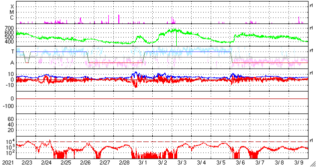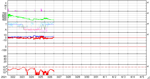 2021/ 3/22 13:37 600km/秒の高速太陽風が続き、磁気圏の活動も強まっています。