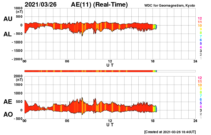 下段のAEグラフの値が高くなると、オーロラ活動が活発化しています。