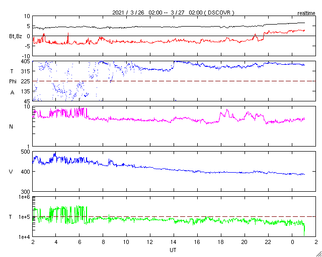 2021/ 3/26 13:09 太陽風は平均的な状態です。20日のニュージーランドのオーロラをどうぞ。