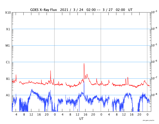 GOES衛星の太陽X線強度。赤・橙 = 0.1〜0.8 nm、青・紫 = 0.05〜0.4 nm