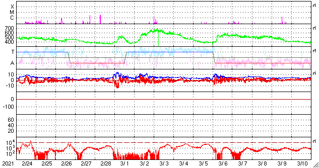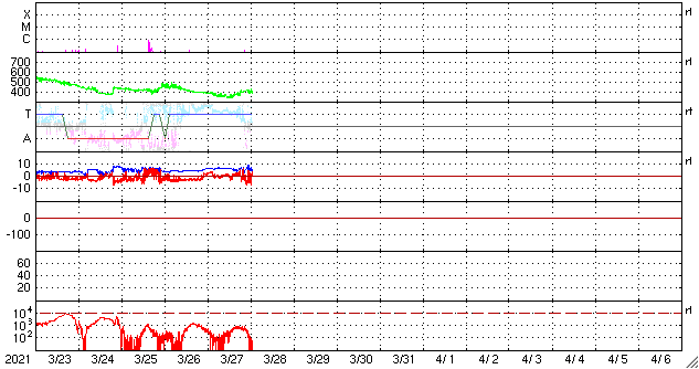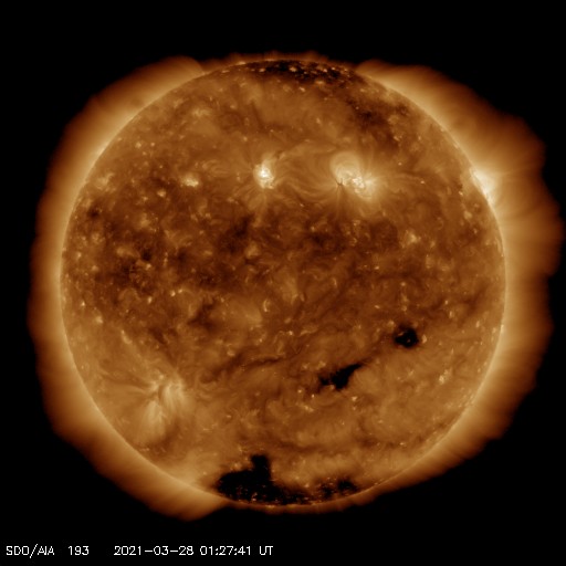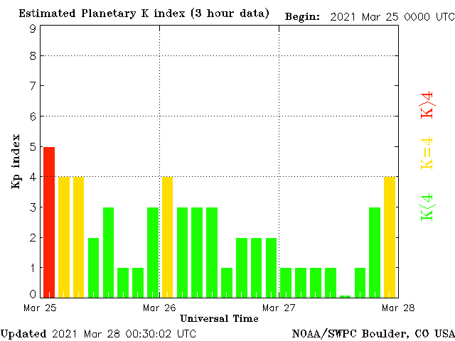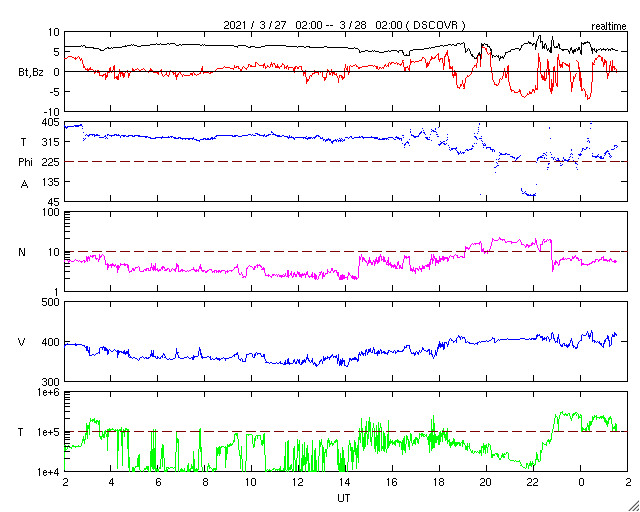 2021/ 3/28 10:41 更新 太陽風は平均的な速度に戻っています。磁気圏の活動がやや高まっています。 担当 篠原 太陽風の速度は、350km/秒まで下がりましたが、 400km/秒と平均的な速さに戻っています。 磁場強度は、5〜6nTと平均的な状態です。 磁場の南北成分は、0nT付近で小さく変化していましたが、 今朝以降、変化がやや大きくなり、 -5nTの南向きの変化が繰り返されています。 このため、磁気圏の活動が強まっている様で、 磁気圏の活動度を示している NOAA/SWPCのPlanetary K-indexの数値が高まっています。 (AE指数は停止が続いています) オーロラの活動も強まっているのではないでしょうか。 この後も磁場の南向きの変化が続けば、 磁気圏の活動も高まった状態が続きますが、 北寄りに傾向が変わると、磁気圏は穏やかになってしまいます。 この後の変化に注目して下さい。 SDO衛星AIA193では、 太陽の東側(左側)にコロナホールは見えていません、 前周期の広がりは消えてしまった様です。 太陽は、2811黒点群は見えなくなり、 2812群だけになっています。 X線グラフも特に変化はなく、穏やかです。