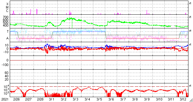 磁場強度は、3〜4nTとやや弱い状態です。