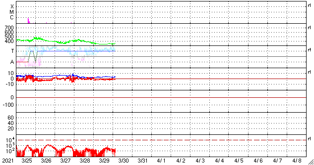 2021/ 3/28 10:41 太陽風は平均的な速度に戻っています。磁気圏の活動がやや高まっています。