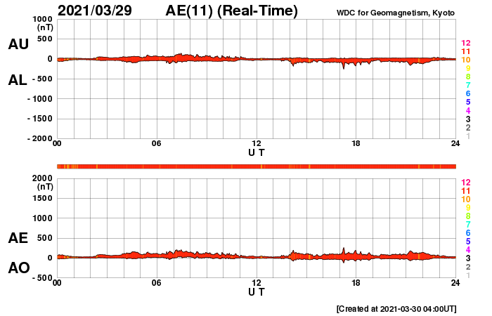 下段のAEグラフの値が高くなると、オーロラ活動が活発化しています。
