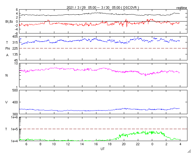 2021/ 3/29 09:11 太陽風は低速になっています。磁気圏も穏やかです。