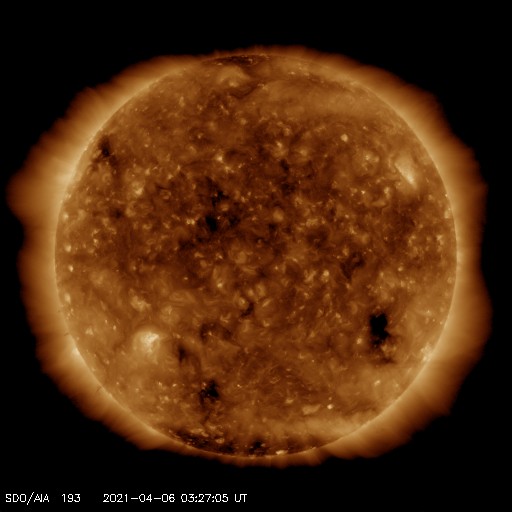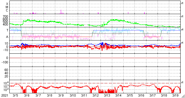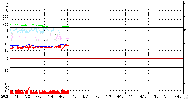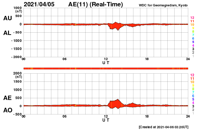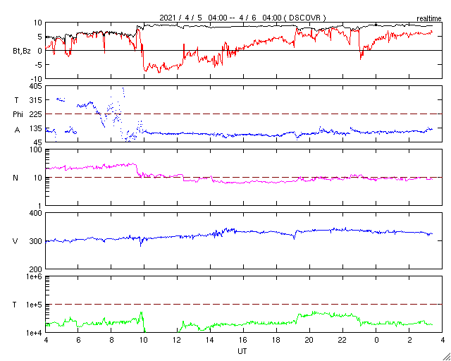 2021/ 4/ 6 12:31 更新 太陽風は低速です。磁場の強まりが到来しています。 担当 篠原 太陽風の速度は、 300km/秒から330km/秒へ少し上がっていますが、 低速の状態は続いています。 磁場強度は、5nTから9nTへ急に強まる変化が到来し、 以降、やや強まった状態が続いています。 磁場の南北成分は、南向きに大きく振れて、 次第に北向きに切り替わる変化をしています。 SDO衛星やSTEREO Ahead衛星の画像を調べると、 3月30日にフィラメント噴出が太陽の北半球側で発生して、 弱いCMEが地球の方向に飛び出していました。 この乱れが、低速風により6日ほどかけて 地球へ到達したのかもしれません。 磁場は南向きに強まりましたが、 太陽風の速度が下がっているため磁気圏への影響は小さく、 AE指数は400nTの小規模の変化が発生しただけです。 その後は、磁場が北寄りになっているため磁気圏は静穏です。 磁場の強まりは次第に下がり、 低速の穏やかな太陽風が続きそうです。 太陽は、2813黒点群が小さく見えているだけです。 X線グラフは変化がなく、太陽は穏やかです。