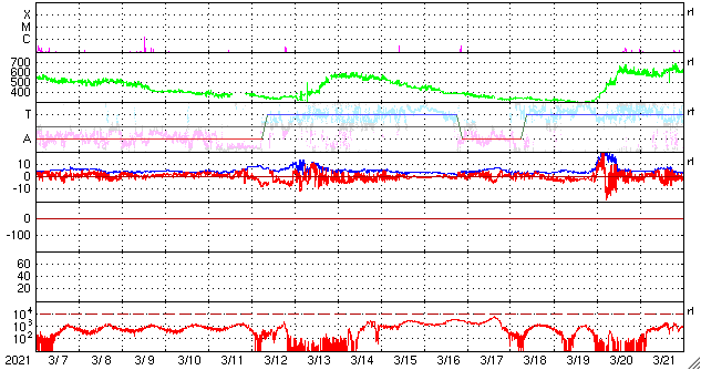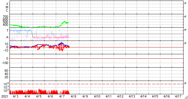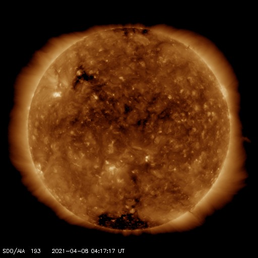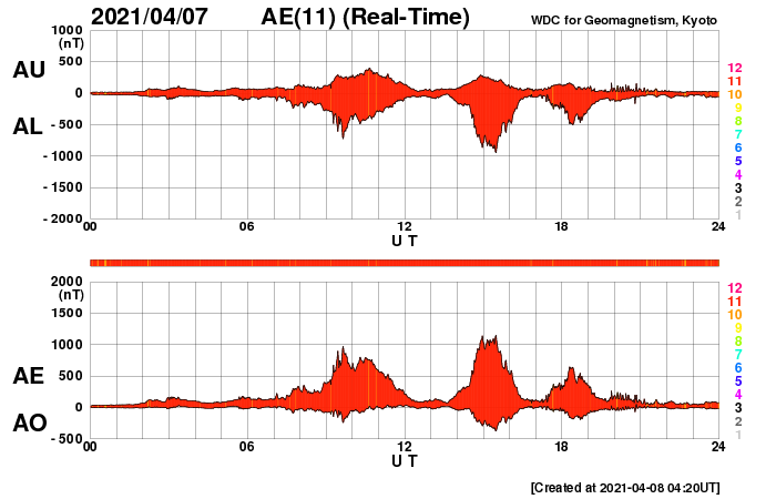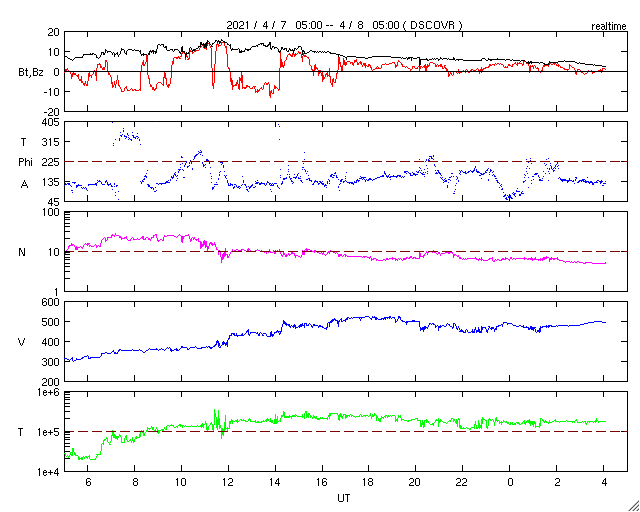 2021/ 4/ 8 13:25 更新 太陽風の速度が500km/秒に高まっています。磁気圏の活動が一時的に強まりました。 担当 篠原 昨日の夜から太陽風の速度が上がり、 500km/秒の高速風になっています。 磁場強度も速度が上がる頃に15nTまで強まりましたが、 以降は下がり、現在は3nTとやや弱くなっています。 4日位前に太陽の中央部に見えていた 淡いコロナホールの影響がやって来たのかもしれません。 磁場が強まった頃に、 -10nTに達する強い南向きの変化が発生しました。 この影響で磁気圏の活動が強まり、 AE指数は1000nTの大きい変化が2回発生しています。 その後は、磁場は北寄りになっていて、 磁気圏の活動は静かになっています。 太陽風の磁場強度が既に下がっていることと、 コロナホールが淡かったことから、 高速の太陽風は短い時間で終わるのではないでしょうか。 SDO衛星AIA193では、 北東側(左上)に小さいコロナホールが見えています。 太陽は、昨日北東に見えていた黒点は消えてしまい、 無黒点になっています。