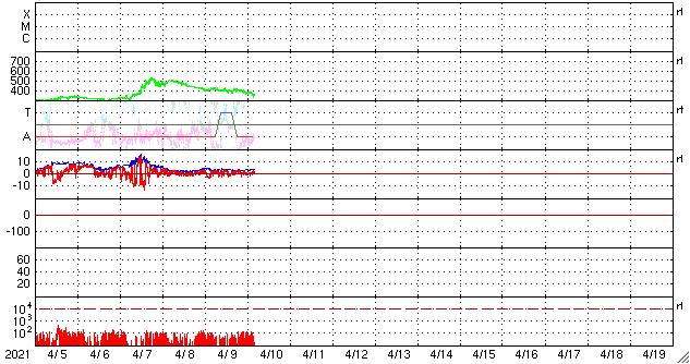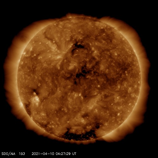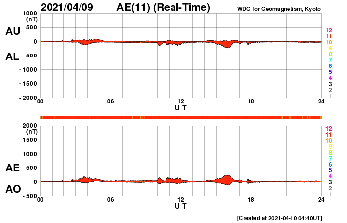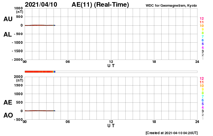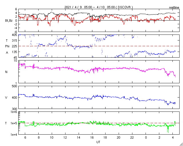 2021/ 4/10 13:31 更新 太陽風は低速になり、磁気圏も穏やかです。 担当 篠原 太陽風の速度は、今朝くらいに400km/秒台を割り、 現在は350km/秒と低速の風になっています。 磁場強度は、3〜4nTとやや弱い状態です。 磁場の南北成分は、0nT付近か弱い北寄りになっています。 磁気圏は穏やかで、 AE指数は小さい変化が時々起きている程度です。 SDO衛星AIA193では、 太陽の中央部にコロナホールは見られず、 しばらく低速の穏やかな太陽風が続きそうです。 太陽は無黒点です。 X線グラフも変化はなく、 太陽は、とても穏やかな状態が続いています。 ![]() SDO衛星のAIA193カメラによる太陽コロナの様子 (c) SDO (NASA) ![]() SDO衛星による太陽の可視光写真 (c) SDO (NASA) ![]() DSCOVRが観測した太陽風の磁場(1番上の枠、黒線は全体の強度、赤線は南北成分) および、太陽風の密度(3番目の紫線)、速度(4番目の青線) (c) データ:NOAA/SWPC、作図:宇宙天気ニュース ![]() AE指数(速報値) 下段のAEグラフの値が高くなると、オーロラ活動が活発化しています。 (c) 京都大学WDC ![]() ![]() 27日の太陽周期に合わせたデータプロット 太陽が同じ面を地球に向けていた27日前の変化から、今後を予想することができます。 (c) 作図:宇宙天気ニュース