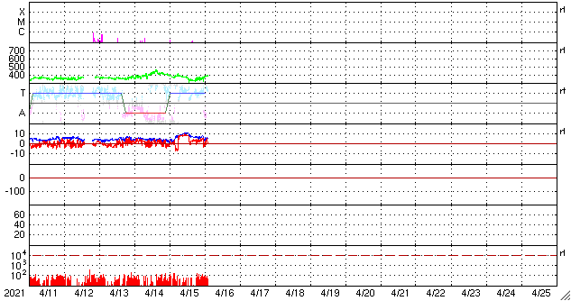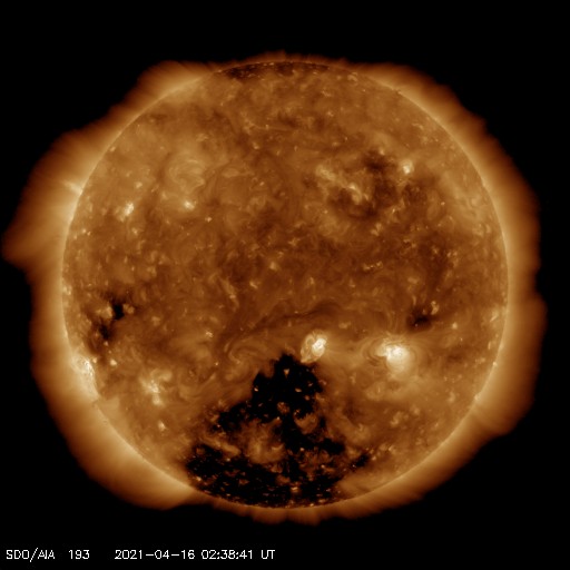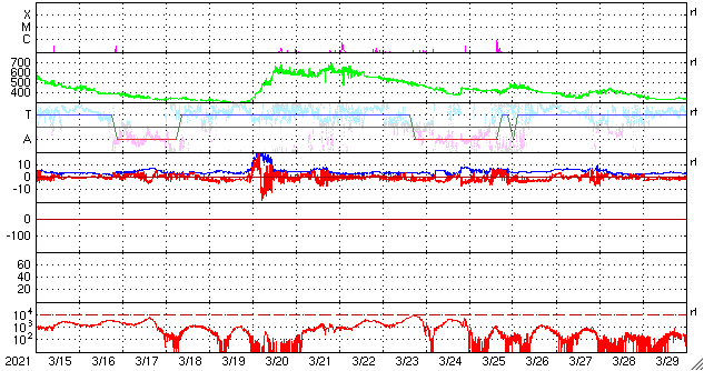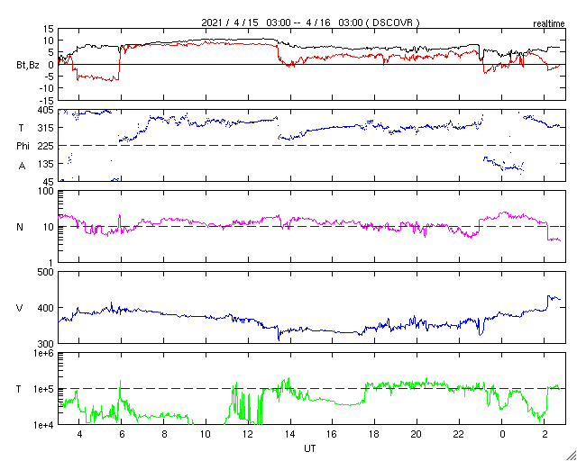2021/ 4/16 11:52 更新 太陽風は平均的な速度です。新しい黒点が2か所に現れています。 担当 篠原 昨日のニュース以降、 太陽風磁場の南向きへの強まりは、2時間ほど続きました。 磁気圏の活動も一時的に高まって、 AE指数は800nTの中規模の変化が発生しています。 その後、磁場の南北成分は北向きに切り替わり、 磁気圏は静かになっています。 北向きの強まりは7時間ほど続いたので、 オーロラ観望としては、 逆の向きであればもっと活発な変化が見られたでしょう。 太陽風の速度は、 昨夜にかけて400km/秒から350km/秒へ下がり、 今朝くらいからゆっくりと高まって、 現在は400km/秒を超えたくらいと平均的な状態になっています。 磁場強度は、昨日の午後は10nTくらいに強まっていましたが、 現在は5〜7nTと落ち着いています。 SDO衛星AIA193を見ると、 太陽の中央部の南半球側にコロナホールが広がっています。 今後はこの領域の影響に注目してください。 太陽風はどの様な速度の変化になるでしょうか。 太陽は、昨日注目していた南東の端(左下)から黒点が現れています。 また、中央部の南側に昨夕から黒点が新しく出現しています。 今朝のNOAAの報告では群番号はまだ付けられていませんでしたが、 このまま黒点群が3つとなれば、 NOAAの報告で3群が同時に現れるのは、 1月24日以来、およそ3か月ぶりになります。 X線グラフは特に変化はなく、 フレアの活動は穏やかです。