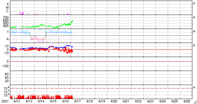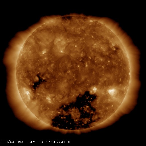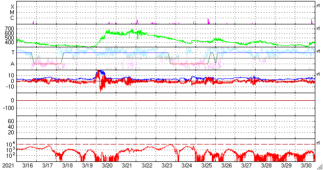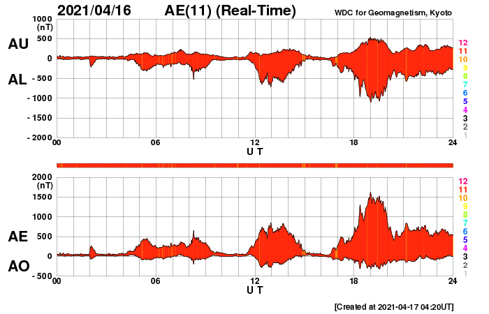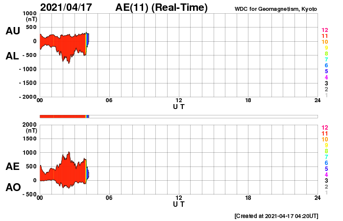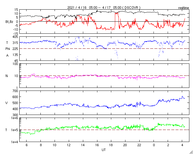 2021/ 4/17 13:31 更新 高速太陽風が到来し、600km/秒に達しています。磁気圏の活動も高まっています。 担当 篠原 太陽風の速度はゆっくりと上昇して、 今朝くらいに500km/秒を超え、 グラフの最後は600km/秒に高まっています。 磁場強度は、速度が高まる頃に12nTに達し、 現在は少し下がっていますが、8nTとやや強まった状態です。 SDO衛星AIA193で注目していた 南半球のコロナホールの影響が始まった様です。 27日周期の図を見ると、 前周期は650km/秒くらいまで速度が高まりました。 今回はどこまで上昇するでしょうか。 太陽風の磁場強度がまだ少し強まっているので、 速度の上昇は更に続くかもしれません。 太陽風磁場の南北成分は、 今日に入った頃から南寄りに強まっていて、 -5〜-10nT程度の変化が半日ほど発生しています。 このため磁気圏の活動も高まって、 AE指数は800nT程度の中規模の活動が続き、 最大では、1500nTに達する大きな変化も発生しています。 太陽風のグラフの後半では、 磁場の南向きの変化は少し小さくなっていますが、 速度が一段と高まっているので、 磁気圏の活動は活発な状態が続く可能性があります。 引き続き注目してください。 太陽では、新しい黒点に、 2815、2816群と番号が付けられています。 ただし、右側の2814群と2815群は黒点が消えかけていて、 東端の2816群だけになってしまうかもしれません。 X線グラフは、Bクラスの小さい変化が発生する程度で、 太陽の活動は穏やかです。