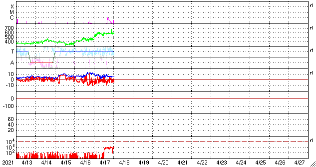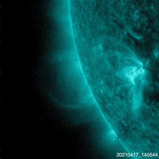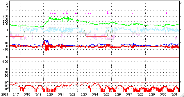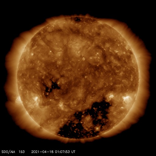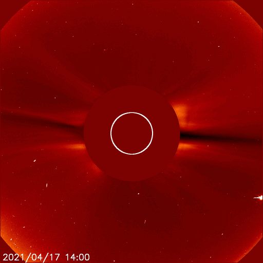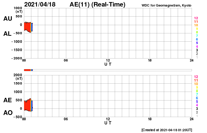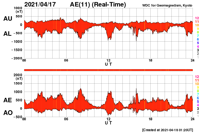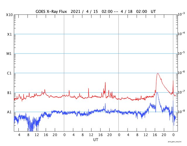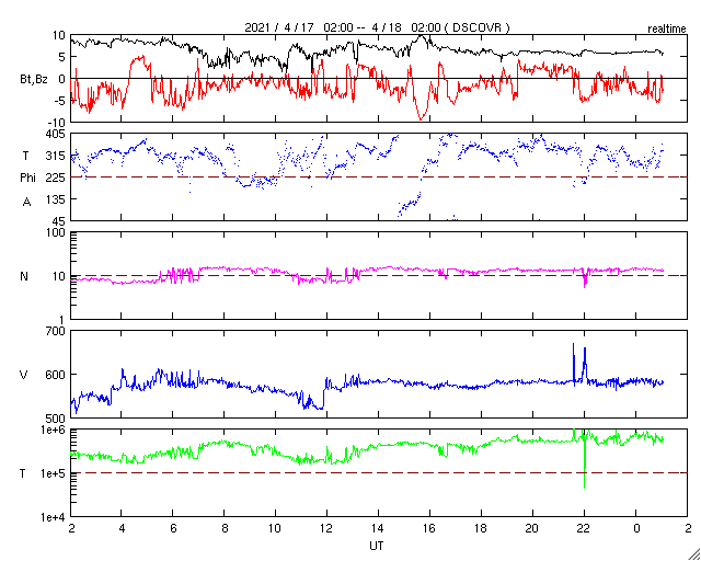 2021/ 4/18 10:17 更新 太陽の東端で小さいフレアが発生しました。高速の太陽風が続き、磁気圏も活動的です。 担当 篠原 今日未明、18日1時半(世界時17日16時半)に、 B9.7の小さいフレアが発生しました。 SDO衛星AIA131による動画を掲載します。 これを見ると、フレアが発生したのは太陽の東端(左端)の向こう側です。 従って、本当のフレアの規模はこれよりも大きい可能性があります。 SOHO衛星LASCO C2、C3では、 太陽の左側に向かってCME(コロナ質量放出)が飛び出す様子が 撮影されています。 地球に対しては横向きなので、影響はないでしょう。 この後、太陽の東端から活動的な領域が現れると思われます。 どの様な領域か注目してください。 現在見えている黒点は、 西側(右側)の2814、2815群はかなり小さくなっています。 太陽風は、580km/秒と高速の状態が続いています。 磁場強度は、8nTから5nTへ少し下がり、平均的な値に戻っています。 磁場の南北成分は、南寄りの変化が続いています。 このため、磁気圏の活動は活発な状態が続き、 AE指数は、500〜1000nTの中規模の変化が続いています。 太陽風のデータでは磁場強度が少し下がって来たので、 この後の磁気圏の活動は、規模が少し小さくなるかもしれません。 SDO衛星AIA193では、太陽の南半球のコロナホールは、 後半の領域(左側の領域)が、太陽の中心線にかかっているところです。 高速の太陽風は、もう5日くらい続くかもしれません。