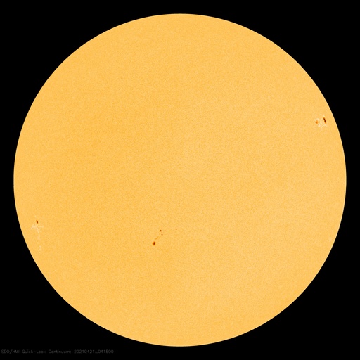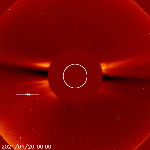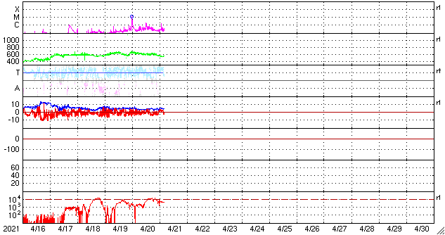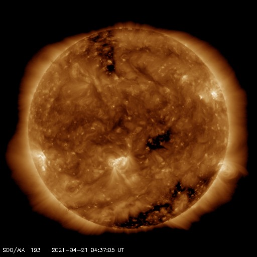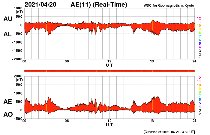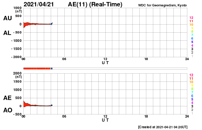 2021/ 4/21 13:48 更新 高速太陽風の速度が下がり始めています。イエローナイフのオーロラをどうぞ。 担当 篠原 カナダ・イエローナイフの大塚さんより、 現地17日23時(世界時18日5時)に撮影された オーロラの写真をいただきました。 今回の高速太陽風が始まって2日目、 速度が600km/秒近くに高まっていた頃のオーロラです。 AE指数は500nTの中規模の変化が発生しています。 全天をオーロラの光が覆っていて、 強い光の帯がちょうど頭の上で輝いています。 大塚さんは、YouTubeにオーロラの動画を掲載されていて(リンク)、 今回の高速太陽風の期間中の 素晴らしいオーロラの様子も見ることができます。 実際の速度で動くオーロラの姿はとても魅力的です。 見事な写真をどうもありがとうございます。 現在の太陽風は、速度が下がり始めていて、 今日未明に600km/秒台を割り、現在は540km/秒あたりです。 高速の状態は続いていますが、 高速風領域としては後半に入っているのかもしれません。 太陽風の磁場強度は、 4nT前後と平均的な状態を保っています。 南北成分は、南寄りの変化が続いていて、 AE指数は300〜700nTの中規模の活動が続いています。 SDO衛星AIA193を見ると、 南半球のコロナホールは、太陽の西の端に近づいていて、 この後、太陽風への影響は弱くなります。 太陽風速度の高まりは、次第に落ち着いて行くでしょう。 昨日のM1.1フレアに伴って発生したCME(コロナ質量放出)を、 SOHO衛星LASCO C2、C3の動画で紹介します。 これによると、CMEは太陽の東寄り(左寄り)に噴出しています。 フレアの発生地点が太陽の中心近くだったので、 地球方向にもガスが広がっている可能性があります。 CME発生の3〜4日後の23〜24日くらいに 太陽風の乱れが到来するかもしれません。 太陽では、南東(左下)の新しい黒点に、 2818群と番号が付けられています。 一方、北西に見えていた新しい黒点は、その後消えています。 北西の2817群の活動がやや高まっていて、 C1.9、C1.5の小規模フレアの他、 Bクラスの小さいフレアをいくつも起こしています。
