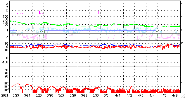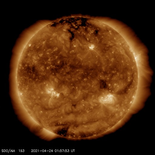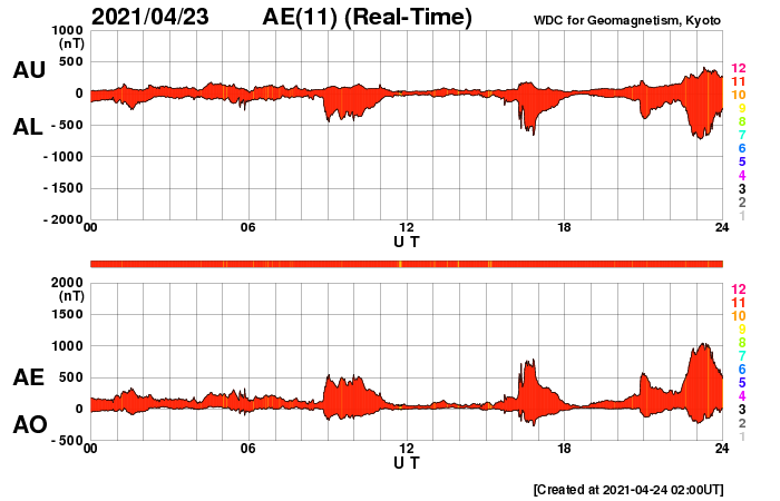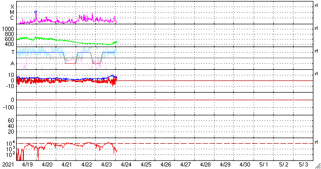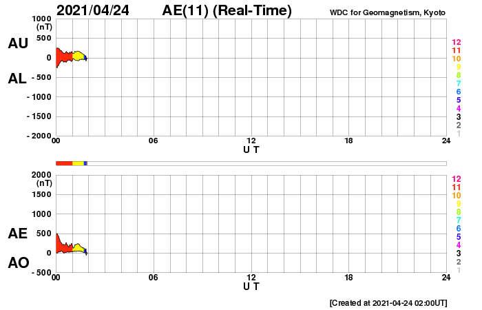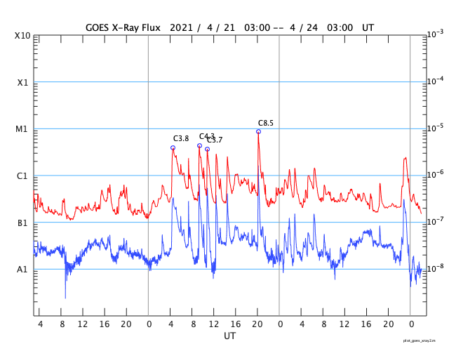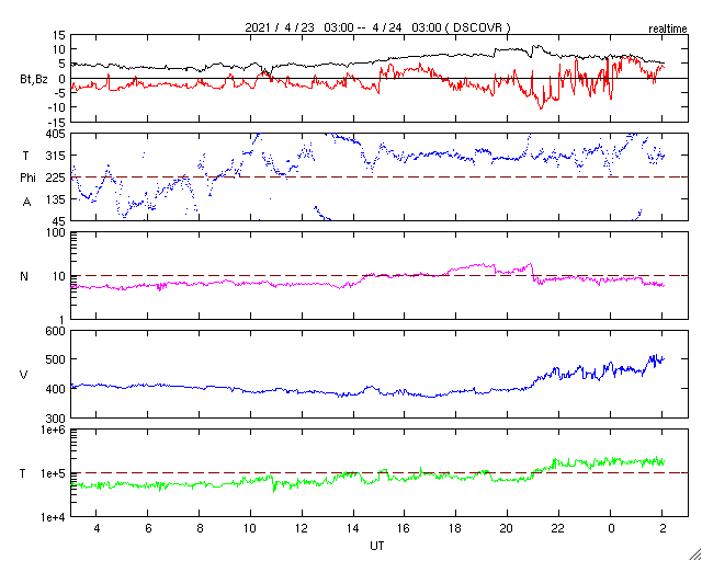 2021/ 4/24 11:11 更新 新しい黒点が現れています。太陽風は500km/秒の高速風になっています。 担当 篠原 昨日のニュースの後、フレアの発生は少なくなっていましたが、 可視光写真では、中央部の北半球側に新しい黒点が現れ、 南東(左下)の2818黒点群の右下側に黒点が出現しています。 SDO衛星AIA131の動画を見ると、 2818群の新しい黒点の領域では小さい活動が頻繁に発生していて、 この後、より規模の大きいフレアを起こす可能性があります。 NOAA/SWPCの発表によると、 今朝、24日9時(世界時23日23時)に、 C2.2とC2.4の小規模フレアが発生しています。 このひとつは、北西(右上)に沈んだ2817群で発生しています。 太陽の向こう側での発生なので、 本当の規模はこれよりも大きかった可能性があります。 また、もうひとつのフレアは 2818群の新しい領域で発生したのかもしれません。 AIA131に明るい光が写っています。 新しい領域の今後の活動に注目してください。 太陽風は、昨夜から磁場強度がゆっくりと上昇して、 今朝には10nTに高まりました。 この頃から速度も高まり始め、 現在は500km/秒と高速の状態になっています。 一方、磁場強度は5nTへ下がり、平均的な状態に戻っています。 20日頃に太陽の中央部に見えていた 比較的小さいコロナホールの影響がやって来たのかもしれません。 コロナホールの広がりを考えると、 太陽風の高まりは短い時間で終わりそうです。 太陽風磁場の南北成分は、南向きの変化が発生していて、 磁気圏の活動はやや高まった状態です。 AE指数は、500〜1000nTの中規模の活動が度々発生しています。 速度が高まってきたので、磁場の南寄りの傾向が続くと、 磁気圏の活発な状態も続くでしょう。 ![]() SDO衛星のAIA193カメラによる太陽コロナの様子 (c) SDO (NASA) ![]() SDO衛星による太陽の可視光写真。マウスの矢印を写真に重ねると、黒点番号付きの写真に切り替わります。 (c) SDO (NASA) ![]() GOES衛星の太陽X線強度。赤・橙 = 0.1〜0.8 nm、青・紫 = 0.05〜0.4 nm (c) データ:NOAA/SWPC、作図:宇宙天気ニュース ![]() DSCOVRが観測した太陽風の磁場(1番上の枠、黒線は全体の強度、赤線は南北成分) および、太陽風の密度(3番目の紫線)、速度(4番目の青線) (c) データ:NOAA/SWPC、作図:宇宙天気ニュース ![]() AE指数(速報値) 下段のAEグラフの値が高くなると、オーロラ活動が活発化しています。 (c) 京都大学WDC ![]() ![]() 27日の太陽周期に合わせたデータプロット 太陽が同じ面を地球に向けていた27日前の変化から、今後を予想することができます。 (c) 作図:宇宙天気ニュース
