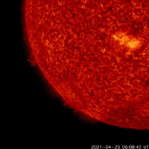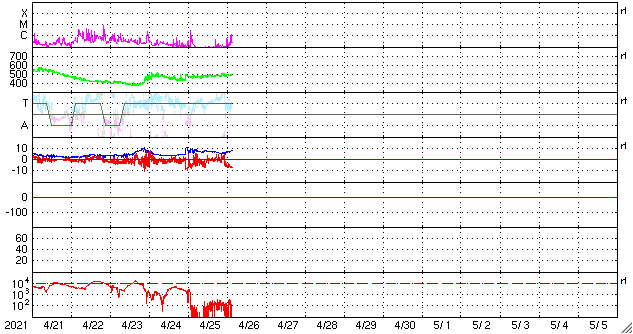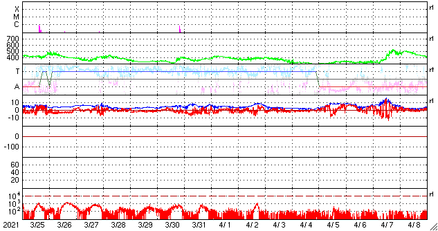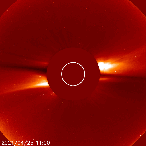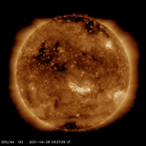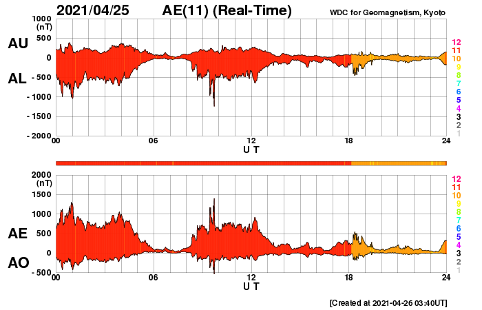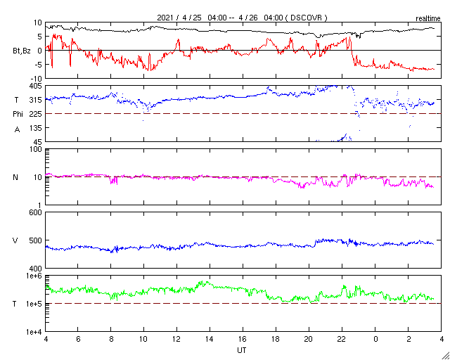 2021/ 4/26 12:51 更新 太陽風はやや高速の状態が続き、磁気圏の活動も高まっています。 担当 篠原 昨日から今朝にかけて、 太陽風は470km/秒とやや高速の状態が続き、 その後、もう少し高まって500km/秒近くに達しています。 磁場強度は、8nTから6nTへ少し下がり、 再び8nTに上がっています。 磁場の南北成分は、 グラフの初めと終わりで南向きに強まっています。 磁気圏の活動も高まっていて、 AE指数は、1枚目の中ほどに700nTの中規模の変化が発生して、 その後穏やかになりましたが、 2枚目に入ると再び高まって、900nT近い変化が発生しています。 磁場の南向きの変化が続けば、 この後も、磁気圏の活動は活発に推移するでしょう。 SDO衛星AIA193では、 太陽の北東側(左上)にコロナホールが見えています。 5日後くらいから、この領域の影響がやって来るかもしれません。 太陽は、中央部に新しく現れた黒点に、 2821群と番号が付けられています。 一方、南西(右下)の2816群は黒点が見えなくなり、 北西(右上)の2819群は、SDO衛星の写真を拡大すると、 かろうじて黒点が見えているくらいです。 SDO衛星AIA304の動画を見ると、 昨夕、25日18時(世界時25日9時)頃に、 太陽の南東側(左下)でフィラメント噴出が発生しています。 薄暗く見えるプラズマのかたまりが、 太陽から左に向かって飛び出しています。 SOHO衛星LASCO C2、C3では、 このフィラメント噴出によるCME(コロナ質量放出)が 撮影されています。 太陽の左側に向かっているので、 地球への影響はなさそうです。