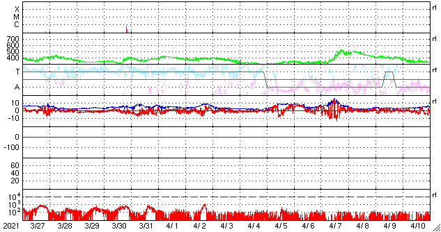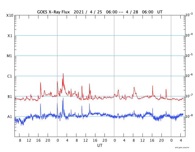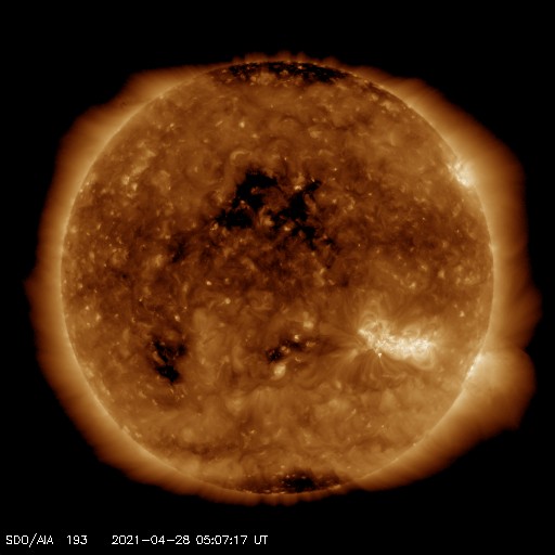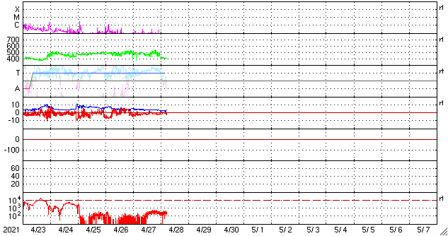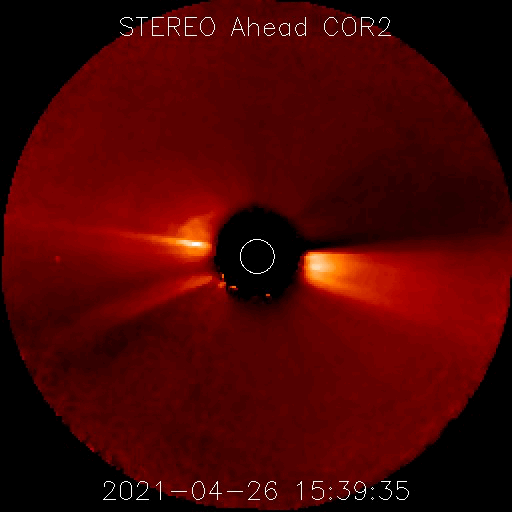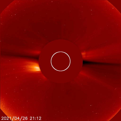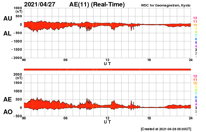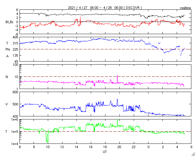2021/ 4/28 14:15 更新 CMEの動画を掲載します。太陽風は平均的な速度に戻っています。 担当 篠原 昨日紹介したフィラメント噴出によるCME(コロナ質量放出)を、 SOHO衛星とSTEREO Ahead衛星の動画で紹介します。 SOHO衛星では、CMEは正面に向かって飛び出しているので、 ガスは非常に淡く見えていて、 太陽の下側やや右寄りを中心に ぼんやりと広がっていく様子が見えています。 CMEを斜め横から見ているSTEREO Ahead衛星では これよりも濃く、 太陽の右下に向かって飛び出す様子が撮影されています。 地球はこの方向にあるので、 太陽風の乱れは地球に向かっているのではないでしょうか。 到来は、30日か5月1日頃になるかもしれません。 磁場の強まりが流れてきて、南向きに強まると、 磁気圏の活動が強まります。 注目してください。 太陽面は、2818、2820、2821群の 3黒点群がまとまって見えています。 フレアは、Bクラスの小さい変化があるだけです。 太陽風は、次第に速度が下がり、 現在は400km/秒と平均的な速さに戻っています。 磁場強度も4nTから2nTに下がり、弱くなっています。 掲載の太陽風のグラフでは、 図の中ほどで速度が500km/秒程度に高まる変化が見えていますが、 変化の様子から、データエラーだと思います。 ACE衛星を参照すると、この頃は450km/秒程度になっています。 磁気圏も穏やかになっていて、 AE指数は小さい変化が見られる程度です。 SDO衛星AIA193では、 太陽の中央部の北側に、淡いコロナホールが見えています。 この領域の影響は見られるでしょうか。 到来は3日後くらいになりそうですが、 CMEによる乱れと重なってやって来るかもしれません。