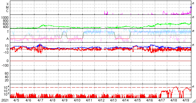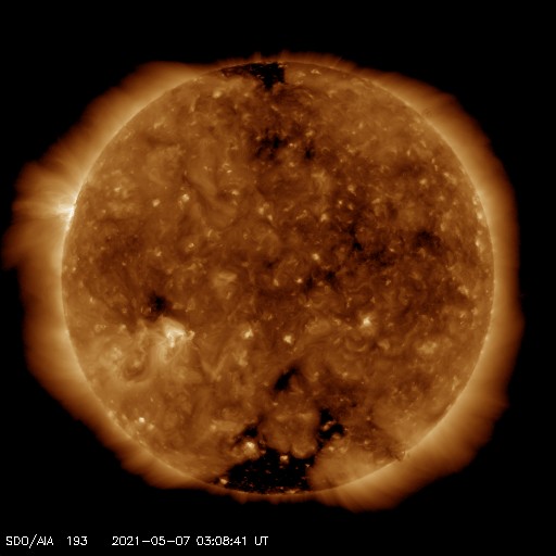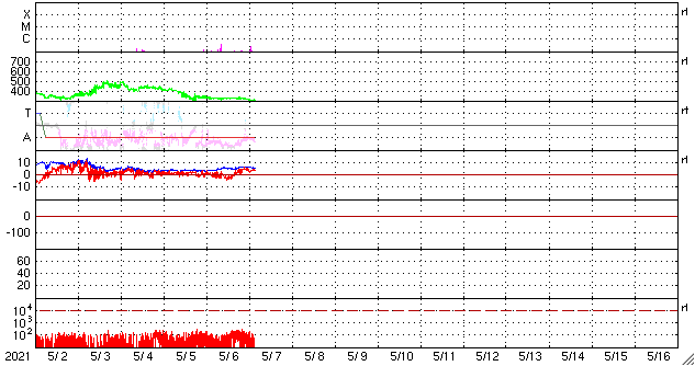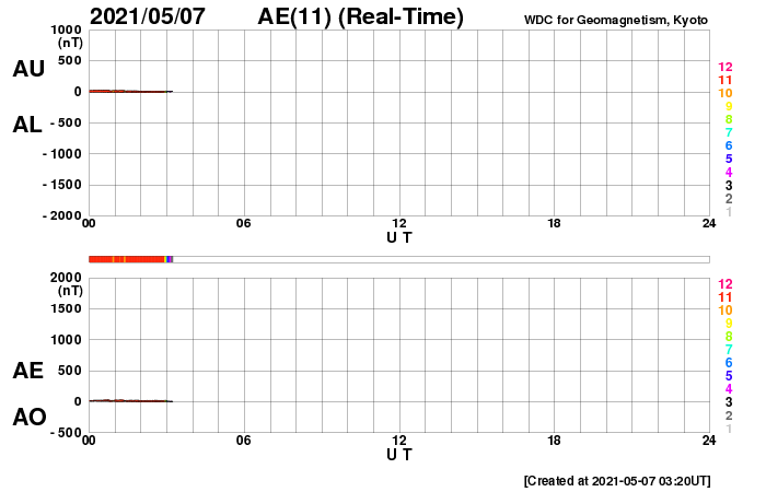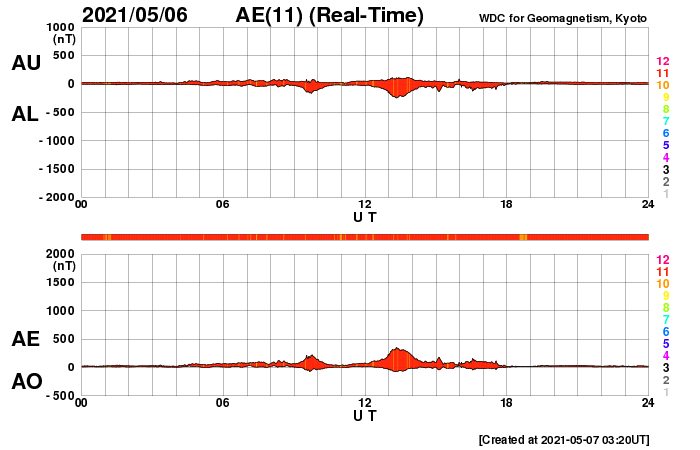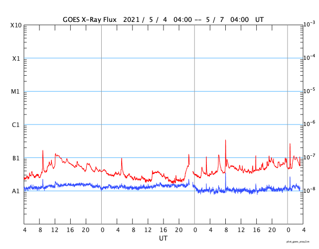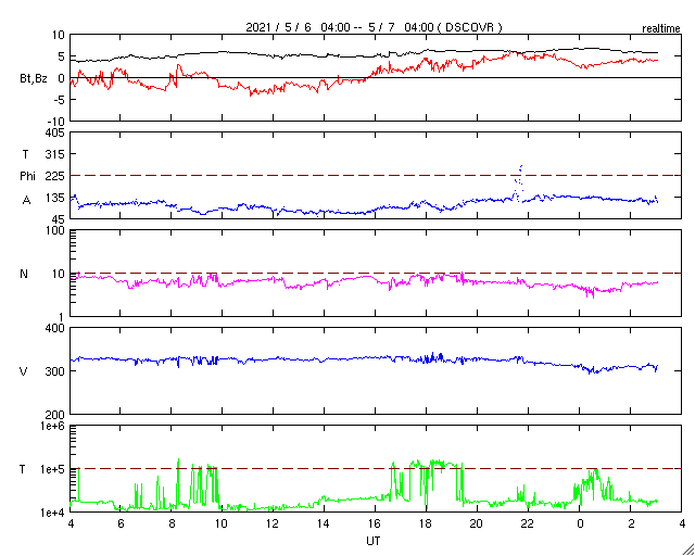 2021/ 5/ 7 12:21 更新 太陽の東端から黒点が現れました。低速の太陽風が続いています。 担当 篠原 太陽の北東の端から、新しい黒点が現れています。 昨日紹介したフレアを起こした領域です。 X線グラフは、 Bクラスの小さいフレアが数回発生しています。 まだ黒点群の全体は見えていませんが、 どの様な活動度になっているでしょうか。 太陽風は、今朝まで330km/秒で推移していましたが、 現在は300km/秒に下がり、さらに低速になっています。 磁場強度は、6nTと平均的な状態に戻っています。 磁気圏は静穏で、 AE指数は、小規模の変化が見られる程度です。 SDO衛星AIA193は、 北極と南極にコロナホールが見えるだけで、 太陽風は穏やかな状態がしばらく続きそうです。