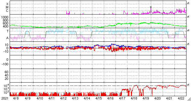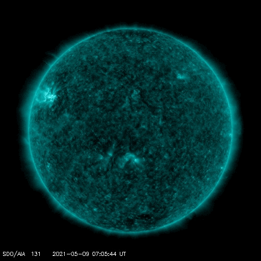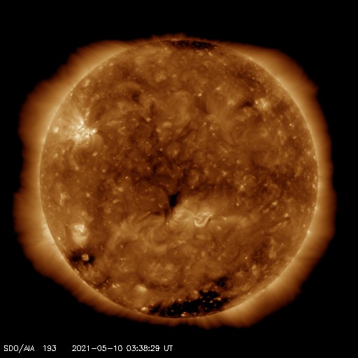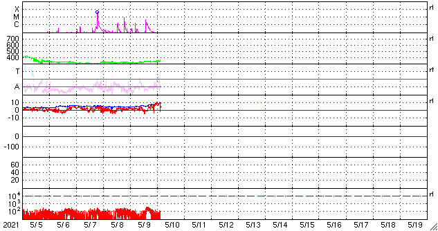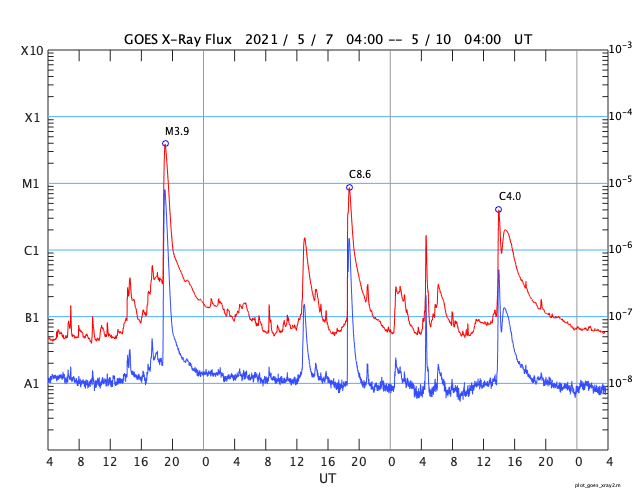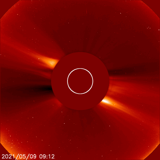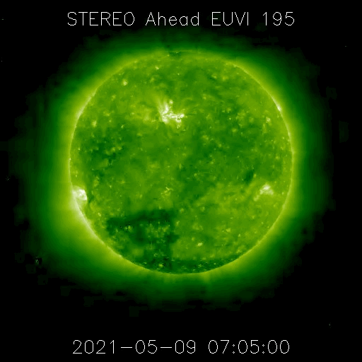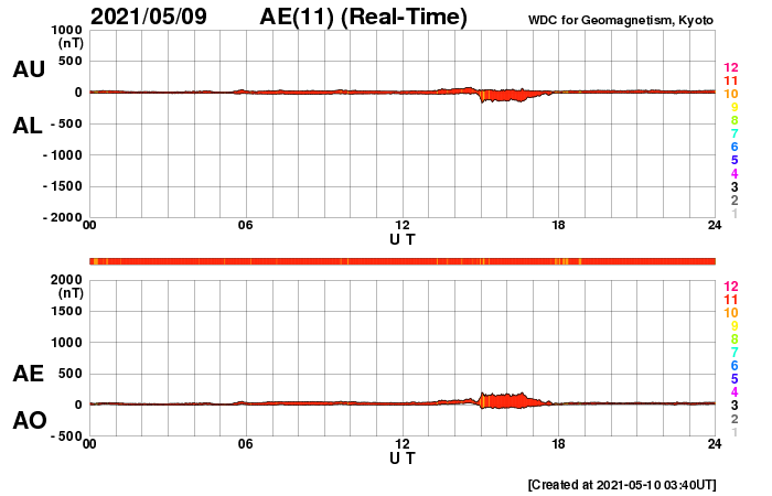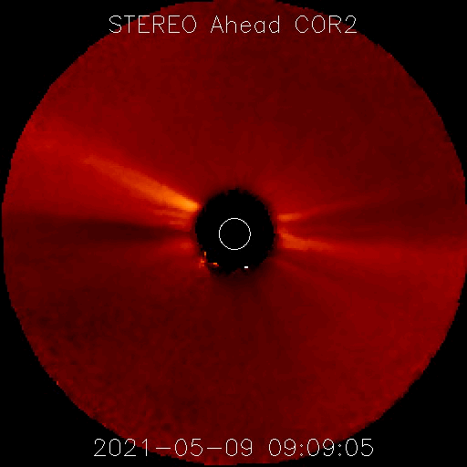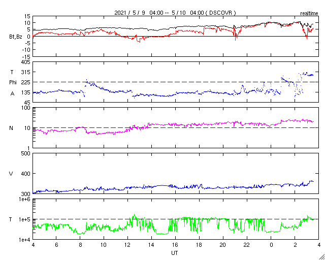 2021/ 5/10 12:53 更新 フィラメント噴出とC4.0の小規模フレアが発生しています。太陽風は低速です。 担当 篠原 太陽で活動が続いています。 昨夜、9日19時(世界時9日10時)に、 太陽の中央部の南側で、フィラメント噴出が発生しました。 SDO衛星AIA131、193、304による動画を掲載します。 フィラメント噴出は、赤の304の動画が見やすいです。 続いて、9日22時半(世界時9日13時半)には、 太陽の北東の2822黒点群でC4.0とC2.0の小規模フレアが 連続して発生しました。 こちらは、青の131と、茶色の193でよく見えています。 これらの現象に伴って、 CME(コロナ質量放出)が発生しています。 SOHO衛星LASCO C2、C3の動画を掲載します。 フィラメント噴出によるCMEは、 地球に向かっているためにとても淡く、 動画ではほとんど見つけられません。 フレアによるCMEは左に向かって勢い良く飛び出しています。 太陽を左斜めから観測しているSTEREO Ahead衛星による EUVI 195とCOR2の動画も掲載します。 この衛星から見ると、フィラメント噴出は太陽の右下で、 フレアはほぼ中央で発生しています。 最初のCMEは地球のある太陽の右側へ向かっているため、 SOHO衛星と違って、はっきりと見えています。 この噴出の様子だと、4〜5日後くらいに 太陽風の乱れが地球に到来するのではないでしょうか。 2つめのCMEは、淡く見えていますが、 太陽全体を囲むように広がっています。 太陽では、南東(左下)に新しい黒点が出現しています。 2822黒点群とともに、これらの活動に注目して下さい。 太陽風は、速度が310km/秒から350km/秒へ少し高まっていますが、 低速の状態が続いています。 磁場強度は、5nTから8〜10nTへやや強まっています。 磁場の南北成分は、北寄りで推移しています。 磁気圏はとても穏やかで、AE指数はほとんど変化のない状態です。 SDO衛星AIA193では、低緯度域にコロナホールは見られず、 太陽風は、CMEによる突発的な乱れが到来しそうですが、 これ以外は穏やかな風が続きそうです。 ![]() 昨夜発生したフィラメント噴出とC4.0の小規模フレア。SDO衛星AIA131、193、304。 (c) SDO (NASA)、(動画加工 : 宇宙天気ニュース) ![]() 2つの現象に伴って発生したCME。SOHO衛星LASCO C2、C3。 (c) SOHO (ESA & NASA)、 (動画加工 : 宇宙天気ニュース) ![]() STEREO Ahead衛星によるフィラメント噴出とC4.0のフレア。EUVI 195。 (c) STEREO (NASA)、 (動画加工 : 宇宙天気ニュース) ![]() STEREO Ahead衛星COR2によるCME。 (c) STEREO (NASA)、 (動画加工 : 宇宙天気ニュース) ![]() SDO衛星のAIA193カメラによる太陽コロナの様子 (c) SDO (NASA) ![]() SDO衛星による太陽の可視光写真。マウスの矢印を写真に重ねると、黒点番号付きの写真に切り替わります。 (c) SDO (NASA) ![]() GOES衛星の太陽X線強度。赤・橙 = 0.1〜0.8 nm、青・紫 = 0.05〜0.4 nm (c) データ:NOAA/SWPC、作図:宇宙天気ニュース ![]() DSCOVRが観測した太陽風の磁場(1番上の枠、黒線は全体の強度、赤線は南北成分) および、太陽風の密度(3番目の紫線)、速度(4番目の青線) (c) データ:NOAA/SWPC、作図:宇宙天気ニュース ![]() AE指数(速報値) 下段のAEグラフの値が高くなると、オーロラ活動が活発化しています。 (c) 京都大学WDC ![]() ![]() 27日の太陽周期に合わせたデータプロット 太陽が同じ面を地球に向けていた27日前の変化から、今後を予想することができます。 (c) 作図:宇宙天気ニュース