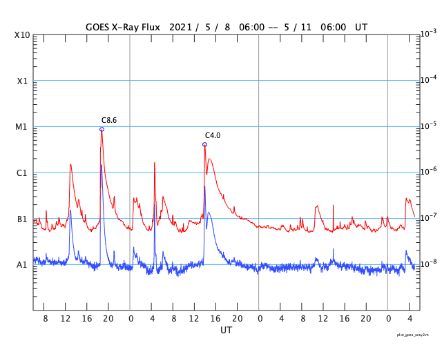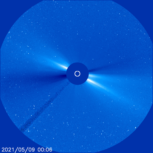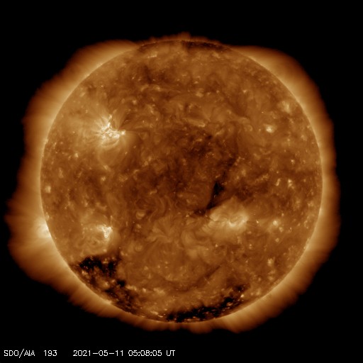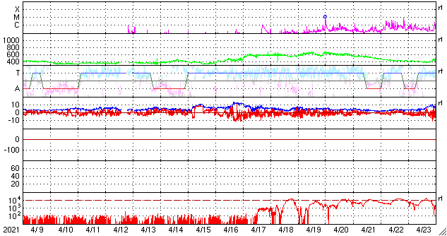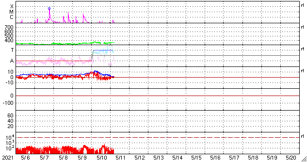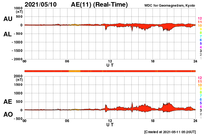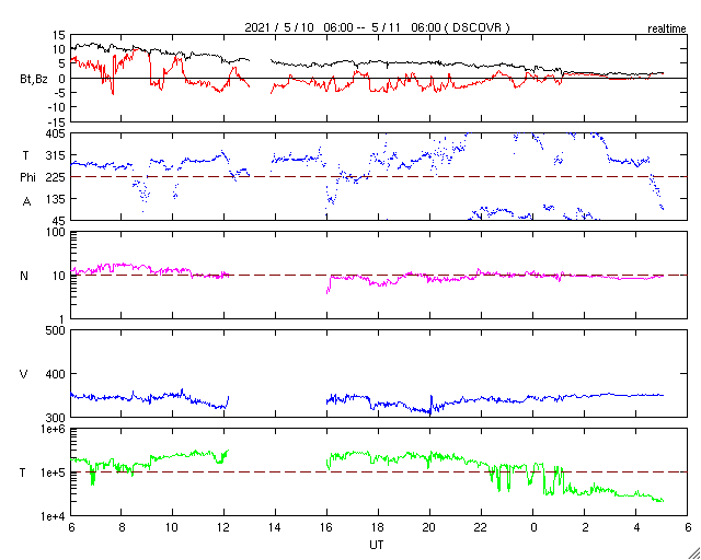 2021/ 5/11 14:20 更新 太陽の活動は落ちついています。4月の黒点相対数は 24.5 でした。 担当 篠原 報告が遅くなりましたが、 4月の黒点相対数は、24.5 と、 WDC-SILSOより発表されています。 月平均値が20台に達したのは、 2020年12月の 23.1 以来4か月ぶりです。 1枚目のグラフを見ると、 活動周期が始まって(2019年12月)1年半くらいの状態としては、 前の周期の同じ頃(2010年4月)と同程度と言えそうです。 無黒点の日は6日と、3月の1日よりも増えています。 5月も月の初めに無黒点の日が続いたので、 同じくらいの日数になるかもしれません。 昨日のニュースに掲載したSOHO衛星の動画について、 訂正があります。 後半のC3の画像として、誤って2日前のものを用いていました。 現在は正しい動画に置き換えています。 申し訳ありませんでした。 正しい動画を見ると、最初のフィラメント噴出によるCMEが、 かなり淡いですが確認することができます。 太陽は、昨日のC4.0、C2.0以降は、 Bクラスの小さいフレアが発生しているだけで、 落ち着いています。 南東(左下)の新しい黒点は、2823群と番号が付けられています。 宇宙天気とは関係ありませんが、 今日のSOHO衛星LASCO C2に、 太陽に近づく小型の彗星が写っています。 LASCO C3の画像と合わせて動画を掲載します。 太陽風は、350km/秒と低速の風が続いています。 磁場強度は、10nTから1nTへ下がり、 かなり弱くなっています。 磁場の南北成分は、グラフの中盤は南寄りになっています。 この影響で、磁気圏の活動が少し高まり、 AE指数に、300〜400nTの小規模の変化がしばらく続いています。 現在は磁場が弱くなっていますが、 この後は、どのような方向になるでしょうか。 SDO衛星AIA193では、太陽の中心部にコロナホールはなく、 穏やかな太陽風が続きそうです。 今後、フィラメント噴出に伴って発生した CME(コロナ質量放出)による太陽風の乱れが到来しそうです。 明後日、13日の夜以降になるのではないでしょうか。 磁場の強まりが到来して南向きに変化すると、 磁気圏の活動が高まるでしょう。