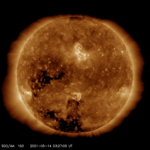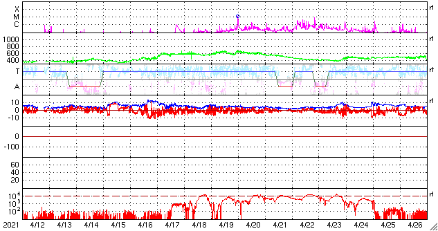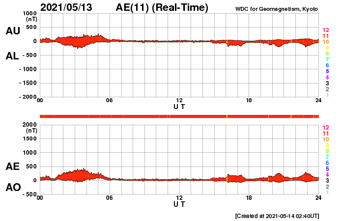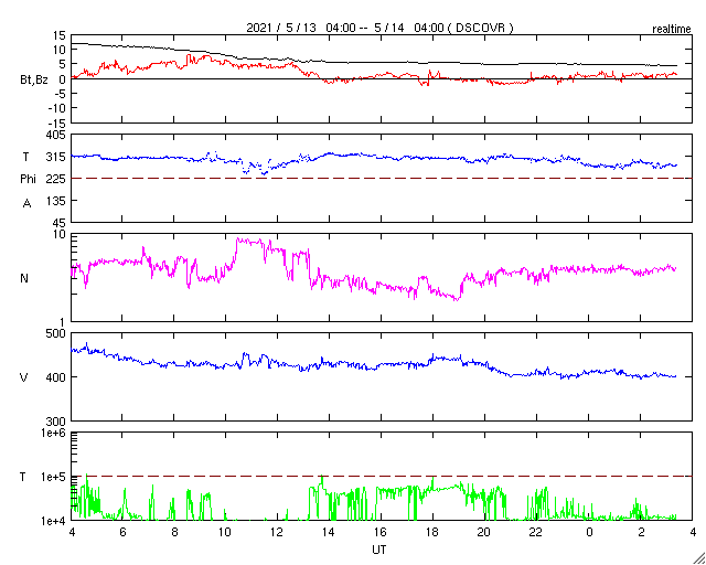 2021/ 5/14 12:40 更新 太陽風は平均的な状態に戻っています。ニュージーランドのオーロラをどうぞ。 担当 篠原 ニュージーランドの米戸 実さんより、 南島クィーンズタウンで、 現地13日1時28分(世界時12日13時28分)に撮影された オーロラの写真をいただきました。 太陽風の乱れが到来した後、 磁場が大きく南向きに変化して磁気圏の活動が高まり、 AE指数の変化が1500nTに達しようとしていた頃の撮影です。 米戸さんによると、 南の地平線辺りが明るくなってきたので撮影を行ったところ、 真っ赤なオーロラが地平から65度の高さまで広がっていたとのことです。 ただし、肉眼では白くも赤くも見えておらず、 写真に撮って初めて気付く状態だったそうです。 この写真は、対角魚眼レンズを使用しているので画角がとても広く、 下は南の地平線を撮っていますが、写真の途中で天頂を超えていて、 左上の天の川が濃くなっているところは いて座、さそり座のあたりですが、 ここは北の空になるそうです。 赤い光に強い天文改造カメラならではの壮大な写真を どうもありがとうございます。 写真中央やや左下で、大マゼラン、小マゼランが 赤い光に飲み込まれているのがとても印象的です。 現在の太陽風は、速度400km/秒、磁場強度4nTと、 どちらも平均的な状態に戻っています。 太陽風の乱れは通り過ぎたと言えそうです。 磁場の南北成分は、0nT付近で小さく変化しています。 AE指数は、小規模の変化が発生する程度で、 磁気圏は概ね静穏です。 SDO衛星AIA193では、 東側(左側)の低緯度域と南極付近の高緯度域に コロナホールが見えています。 3〜4日後くらいから、これらの領域の影響で 太陽風の速度が高まるかもしれません。 太陽は、今朝、14日9時半(世界時14日0時半)に、 南半球の2823黒点群でB5の小さいフレアが発生しています。 北半球の2822黒点群でも、 小さい活動が頻繁に発生しています。 引き続き注目してください。 ![]() ニュージーランド南島クィーンズタウンで、現地13日1時28分(世界時12日13時28分)に撮影されたオーロラ。 (c) 米戸 実氏 ![]() SDO衛星のAIA193カメラによる太陽コロナの様子 (c) SDO (NASA) ![]() SDO衛星による太陽の可視光写真。マウスの矢印を写真に重ねると、黒点番号付きの写真に切り替わります。 (c) SDO (NASA) ![]() DSCOVRが観測した太陽風の磁場(1番上の枠、黒線は全体の強度、赤線は南北成分) および、太陽風の密度(3番目の紫線)、速度(4番目の青線) (c) データ:NOAA/SWPC、作図:宇宙天気ニュース ![]() AE指数(速報値) 下段のAEグラフの値が高くなると、オーロラ活動が活発化しています。 (c) 京都大学WDC ![]() ![]() 27日の太陽周期に合わせたデータプロット 太陽が同じ面を地球に向けていた27日前の変化から、今後を予想することができます。 (c) 作図:宇宙天気ニュース