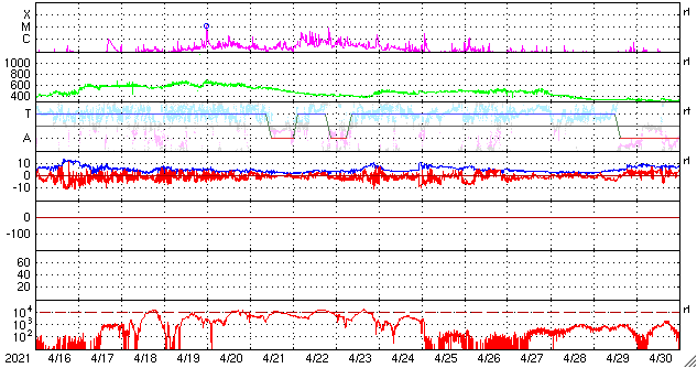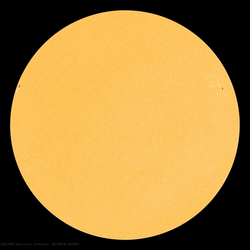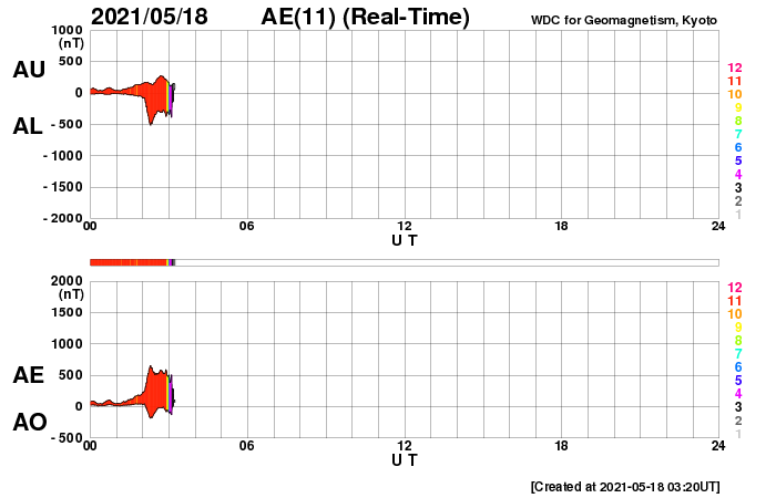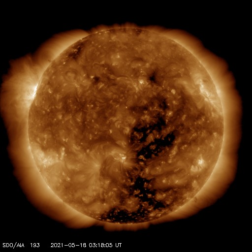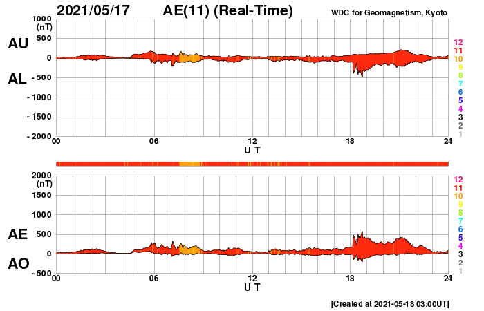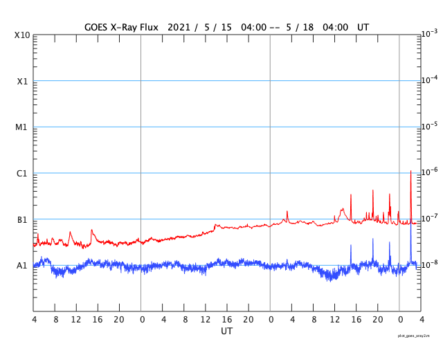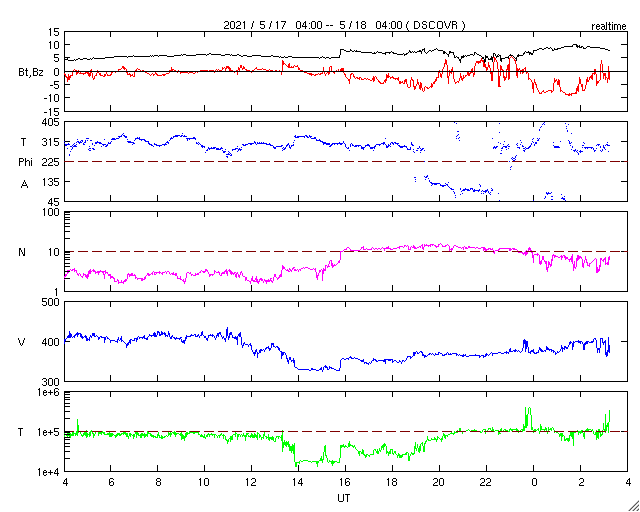 2021/ 5/18 12:25 更新 太陽の東端に黒点が現れています。太陽風は平均的な速度です。 担当 篠原 太陽の東端の北側(左上)から、新しい黒点が現れています。 GOES衛星のX線グラフでは、 昨夜から変化が見られる様になり、 先程、18日11時(世界時18日2時)には、 C1.1の小規模フレアが発生しました。 引き続き、この領域の活動に注目して下さい。 北西側(右上)では、 2822黒点群が太陽の端に近づいています。 太陽風は、速度が400k/秒から330km/秒へ下がり、 再び400km/秒に戻るという小幅の変化をしています。 その途中、磁場強度が5nTから8nTへ急に強まる変化が発生しています。 粒子密度も同時に高まっていて、 14日に発生したCMEの影響が到来したのかもしれません。 変化は小規模で、その後、磁場強度が10nTに強まった程度です。 磁場の強まり以降、 磁場の南北成分が南向きに -5〜-8nT程度の変化していますが、 速度は高まっていないため、磁気圏活動の高まりは限定的で、 AE指数は500nT前後の小中規模の変化が起きている程度です。 SDO衛星AIA193を見ると、 太陽中央部のコロナホールは西に進み、 影響が始まる目安の位置に達しています。 この後、速度の上昇が始まりそうです。