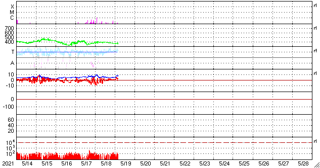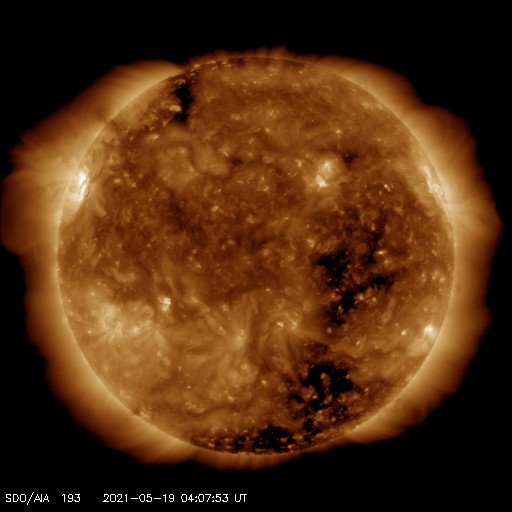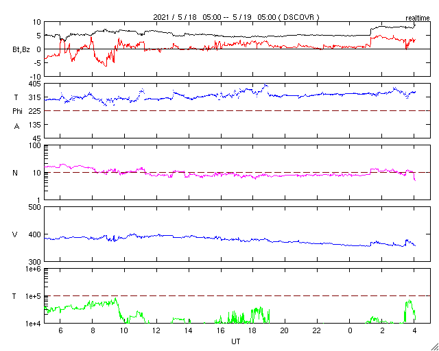 2021/ 5/19 13:20 更新 太陽風は低速になっています。太陽は穏やかです。 担当 篠原 太陽風の速度は、400km/秒から360km/秒へゆっくりと下がり、 低速になっています。 コロナホールの影響はまだ届いていません。 磁場強度は、5nTと平均的な状態が続いていましたが、 グラフの最後に、8nTへ急に強まる小さい変化が起きています。 磁場の南北成分は、 グラフの最初に南向きの変化がありますが、 以降は0nT付近で推移し、 グラフの最後は北向きに変化しています。 このため、現在の磁気圏は穏やかで、 AE指数は、前半に変化が起きていますが、 途中から変化が見られなくなっています。 SDO衛星AIA193の太陽コロナ写真では、 太陽の南半球を縦に伸びるコロナホールは、 西側にだいぶ進んでいます。 引き続き、太陽風速度の変化に注目してください。 太陽は、東端の新しい黒点に、 2824群と番号が付けられています。 昨日のC1.1以降は、 Bクラスの小さいフレアが起きているだけで、 活動としては穏やかです。 また、太陽の中央部の北西側(右上)に、 小さい黒点が現れています。 ![]() SDO衛星のAIA193カメラによる太陽コロナの様子 (c) SDO (NASA) ![]() SDO衛星による太陽の可視光写真。マウスの矢印を写真に重ねると、黒点番号付きの写真に切り替わります。 (c) SDO (NASA) ![]() DSCOVRが観測した太陽風の磁場(1番上の枠、黒線は全体の強度、赤線は南北成分) および、太陽風の密度(3番目の紫線)、速度(4番目の青線) (c) データ:NOAA/SWPC、作図:宇宙天気ニュース ![]() AE指数(速報値) 下段のAEグラフの値が高くなると、オーロラ活動が活発化しています。 (c) 京都大学WDC ![]() ![]() 27日の太陽周期に合わせたデータプロット 太陽が同じ面を地球に向けていた27日前の変化から、今後を予想することができます。 (c) 作図:宇宙天気ニュース