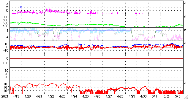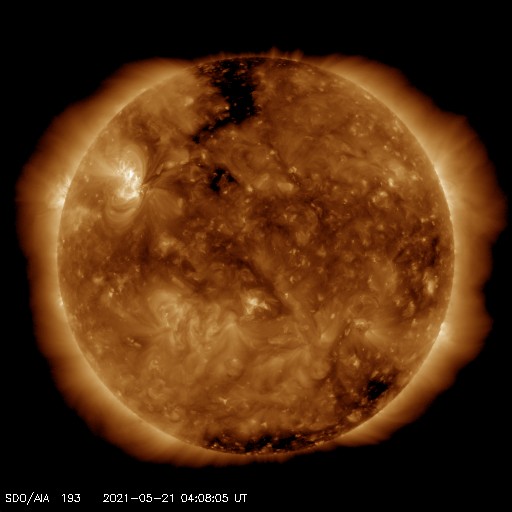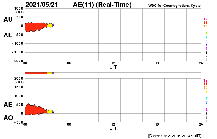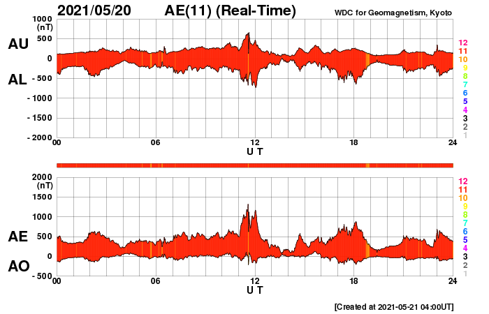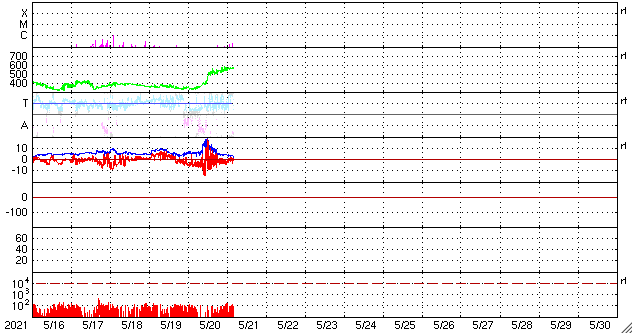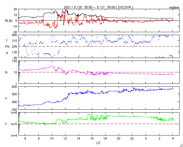 2021/ 5/21 13:17 更新 太陽風の速度は570km/秒へ高まっています。 担当 篠原 ようやく高速の太陽風がやって来ました。 昨夕、20日18時(世界時20日9時)頃から 太陽風の磁場強度と速度が高まり始め、 磁場強度は15nTへ達し、 速度は昨夜の段階で500km/秒へ達し、 その後もゆっくりと上昇して、 現在は570km/秒に高まっています。 一方、磁場強度は4nTと平均的な状態に戻っています。 磁場の南北成分は、初めに大きく南向きに振れた後、 次第に変化が小さくなりながら、 今朝くらいまで南寄りの傾向が続きました。 このため、磁気圏の活動も高まって、 AE指数は、最初の磁場の強まりの頃に 1200nTに達する大きな変化が発生し、 以降も、500nT前後の中規模の変化が続いています。 グラフの最後では、磁場の南北成分は 0nT付近で小さく変化する様になっています。 この状態が続くと、磁気圏の活動は落ち着いて行くでしょう。 SDO衛星AIA193を見ると、 今回の高速風の発生源と思われるコロナホールは、 太陽の西の端近くに達しています。 東西(横方向)の広がりはあまりなかったので、 高速太陽風は比較的短い時間で終わりそうです。 現在の高速風がどこまで続くか、注目して下さい。 太陽は、北東(左上)に2824黒点群と、 中央部の南側(下側)に昨日も見えていた小さい黒点が残っています。 SDO衛星AIAカメラの動画を見ると、 2824黒点群で小さい活動が目立つ様になっていて、 X線グラフでは、Bクラスの小さい変化が起きています。 この後、より規模の大きい変化が発生するかもしれません。 また、東端の向こうから活動的な領域が近づいている様です。 どの様な領域が現れるでしょうか。