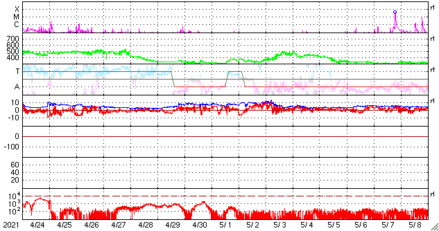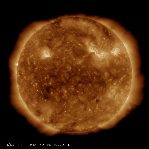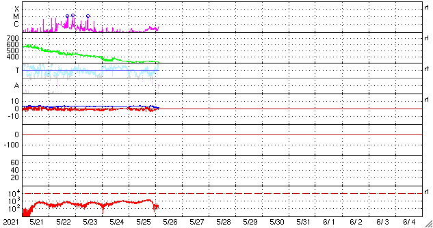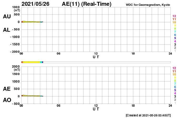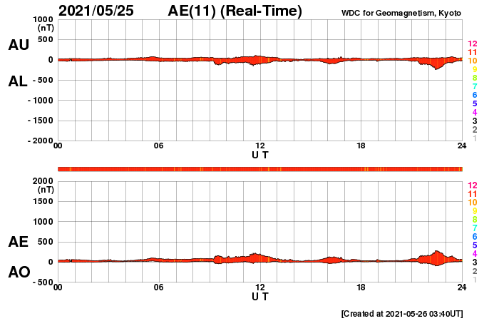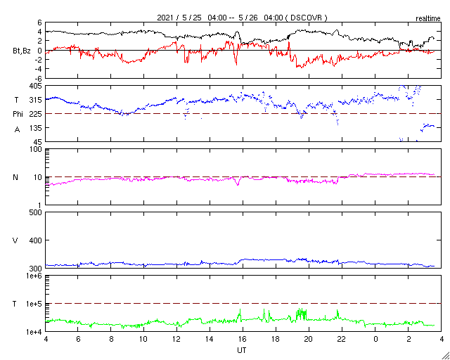 2021/ 5/26 12:41 更新 太陽風は低速の状態が続いています。乱れはまだ到来していません。 担当 篠原 太陽風は、低速の穏やかな状態が続いています。 速度は310〜320km/秒で安定し、 磁場強度は4nTから2nTへ下がっています。 22日夜から23日にかけて発生したCME(コロナ質量放出)による 太陽風の乱れが近づいていると思われます。 今後の太陽風の変化に注目してください。 現在の磁気圏は穏やかです。 AE指数は、小規模の変化が見られる程度です。 太陽では、2824黒点群の右側に発生していた黒点に、 2826群と番号が付けられています。 この黒点群は、今日に入った頃から急に拡大して、 現在の写真では、2824群と同じくらいの規模になっています。 昨日からの黒点の発達の様子を、 SDO衛星の可視光写真の動画で紹介します。 2826群では、小さい活動も起きている様です。 今後、規模の大きいフレアを起こすでしょうか。 注目してください。 北東(左上)の2825群は、見えなくなっています。