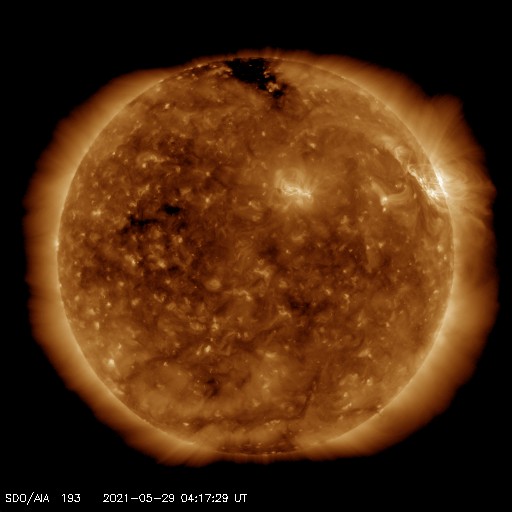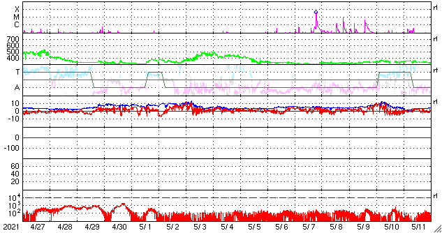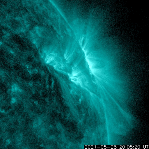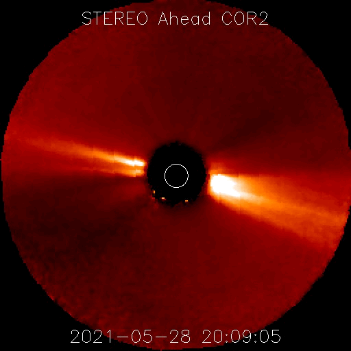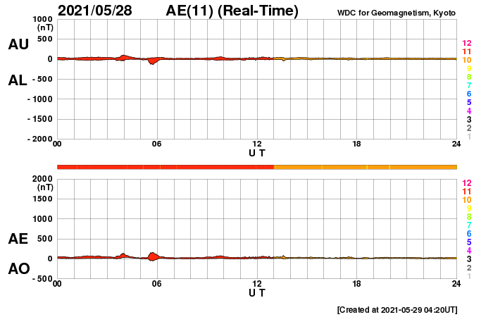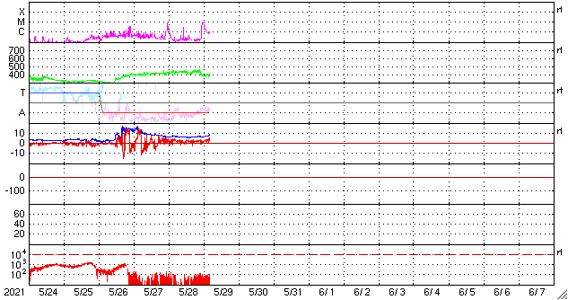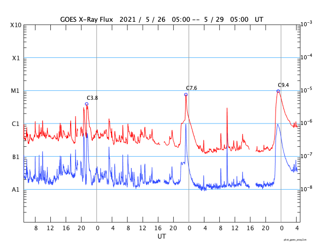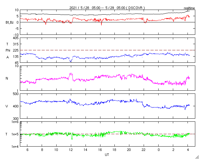 2021/ 5/29 13:26 更新 C9.4の小規模フレアが発生しました。CMEも発生しています。 担当 篠原 今朝、29日7時半(世界時28日22時半)に、 太陽の北西の2824黒点群で、 C9.4の小規模フレアが発生しました。 もう少しでMクラスになるくらいの大きめのCクラスです。 SDO衛星AIA131、193による動画を掲載します。 茶色のAIA193では、 フレアの衝撃がコロナ全体に広がる様子も見えています。 2824黒点群では、昨日もC7.6の小規模フレアが発生しています。 X線グラフを見ると、ちょうど1日前です。 もう1日前にもC3.8がありますが、 これは、西の端に沈みかけている2826黒点群で起きています。 C9.4フレアに伴って、CME(コロナ質量放出)も発生しています。 SOHO衛星の画像は更新がまだなので、 太陽を左斜め50度くらいから観測している STEREO Ahead衛星のCOR2カメラの動画を掲載します。 太陽の右に向かってコロナのガスが勢い良く飛び出しています。 最初のSDO衛星の画像を見ると、フレアが発生した2824群は、 太陽の北西の端にかなり近いところにあります。 地球から見ると、 CMEは横向きに近い斜め右上に噴出していると思われるので、 太陽風の乱れは、到来しても小さい規模に留まりそうです。 SDO衛星では、太陽の中央部北寄りの2825黒点群があった領域に とても小さい黒点が見えている様です。 太陽風は、430km/秒から400km/秒へ少し下がる変化をしていますが、 平均的な速度が続いています。 磁場強度は、6nTからグラフの最後で9nTに少し強まっています。 磁場の南北成分は、北寄りの状態が続いています。 磁気圏は静穏で、AE指数はほとんど変化のない状態です。 SDO衛星AIA193では、太陽の中心部にコロナホールは見られず、 CMEによる乱れを除くと、 太陽風は穏やかな状態が続きそうです。 ![]() 2824黒点群で発生したC9.4の小規模フレア。SDO衛星AIA131、193。 (c) SDO (NASA)、(動画加工 : 宇宙天気ニュース) ![]() C9.4フレアに伴って発生したCME。STEREO Ahead衛星COR2。 (c) STEREO (NASA)、 (動画加工 : 宇宙天気ニュース) ![]() SDO衛星のAIA193カメラによる太陽コロナの様子 (c) SDO (NASA) ![]() SDO衛星による太陽の可視光写真。マウスの矢印を写真に重ねると、黒点番号付きの写真に切り替わります。 (c) SDO (NASA) ![]() GOES衛星の太陽X線強度。赤・橙 = 0.1〜0.8 nm、青・紫 = 0.05〜0.4 nm (c) データ:NOAA/SWPC、作図:宇宙天気ニュース ![]() DSCOVRが観測した太陽風の磁場(1番上の枠、黒線は全体の強度、赤線は南北成分) および、太陽風の密度(3番目の紫線)、速度(4番目の青線) (c) データ:NOAA/SWPC、作図:宇宙天気ニュース ![]() AE指数(速報値) 下段のAEグラフの値が高くなると、オーロラ活動が活発化しています。 (c) 京都大学WDC ![]() ![]() 27日の太陽周期に合わせたデータプロット 太陽が同じ面を地球に向けていた27日前の変化から、今後を予想することができます。 (c) 作図:宇宙天気ニュース
