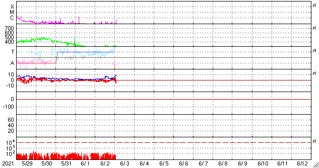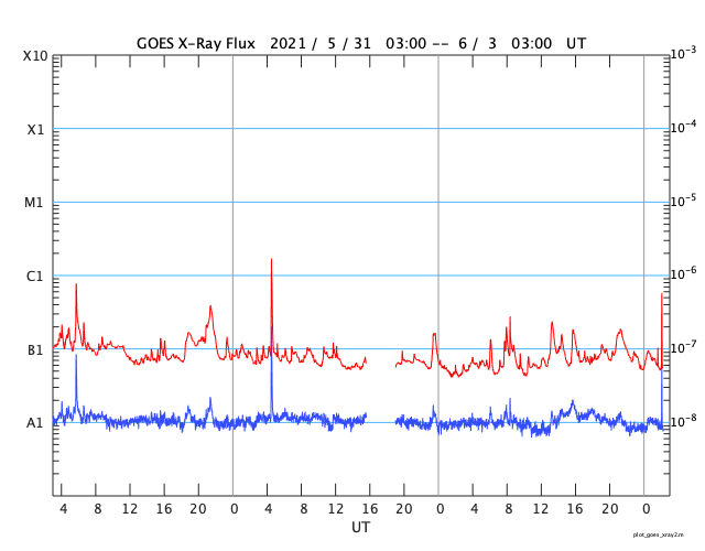 GOES衛星の太陽X線強度。赤・橙 = 0.1〜0.8 nm、青・紫 = 0.05〜0.4 nm (c) データ:NOAA/SWPC、作図:宇宙天気ニュース ![]() | ||||||||||||||||||||||||||||||||||||||||||||||||||||||||||||||||||||||||||||||||||||||||||||||||||||||||||||||||||||||||||||||||||||||||||||||||||||||||||||||||||||||||||||||||||||||||||||||||||||||||||||||