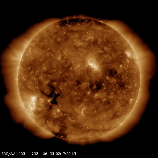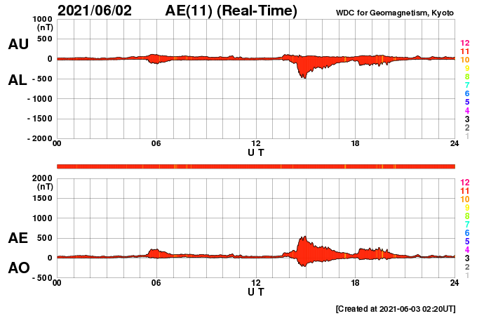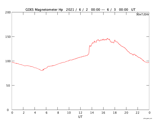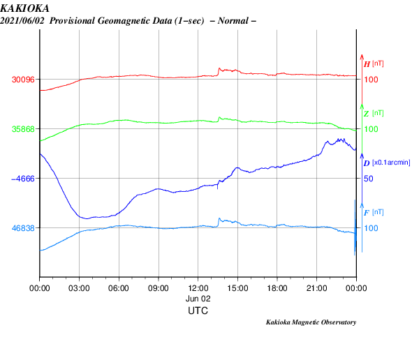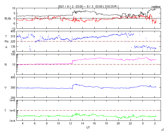 2021/ 6/ 3 11:25 更新 太陽風の小さい乱れが到来しました。太陽風は低速のままで磁気圏も穏やかです。 担当 篠原 昨夜、2日21時20分(世界時2日12時20分)に、 太陽風の小規模の急な強まりがDSCOVR衛星で観測されました。 速度は290km/秒から330km/秒へ、磁場強度は3nTから7nTへ、 それぞれ小幅の高まりが起きています。 29日朝に発生したCMEによる乱れが、 4日半ほどかけて地球に到来したのではないかと思います。 気象庁地磁気観測所(茨城県)の観測によると、 2日22時30分(世界時2日13時30分)頃に 地上でも小さい磁場の強まりが発生しています。 5月27日のニュースでも 太陽風の強まりによる磁場変化を紹介しましたが、 この時の図と比べると、今回の変化が小さいことが分かります。 磁気圏でも同様に磁場の強まりが観測されていて、 静止軌道の朝側にいたGOES衛星の図を掲載します。 現在の太陽風は、速度は300km/秒と低速の状態です。 磁場強度は、一旦、2nTくらいに下がりましたが、 グラフの最後で8nTくらいにやや強まっています。 磁気圏は概ね静穏で、 AE指数は一時的に500nTの変化が発生している程度です。 太陽は、南東に現れた黒点に2829群と番号が付けられています。 Bクラスの小さい活動を起こしていますが、 今後はどうなるでしょうか。 ![]() 気象庁地磁気観測所による地上磁場の変化。太陽風の乱れによる急な強まりが観測されている。 (c) 気象庁地磁気観測所 ![]() GOES衛星による静止軌道の磁場変化。地上と同様に急な強まりが観測されている。 (c) NOAA/SWPC、作図:宇宙天気ニュース ![]() SDO衛星のAIA193カメラによる太陽コロナの様子 (c) SDO (NASA) ![]() SDO衛星による太陽の可視光写真。マウスの矢印を写真に重ねると、黒点番号付きの写真に切り替わります。 (c) SDO (NASA) ![]() DSCOVRが観測した太陽風の磁場(1番上の枠、黒線は全体の強度、赤線は南北成分) および、太陽風の密度(3番目の紫線)、速度(4番目の青線) (c) データ:NOAA/SWPC、作図:宇宙天気ニュース ![]() AE指数(速報値) 下段のAEグラフの値が高くなると、オーロラ活動が活発化しています。 (c) 京都大学WDC ![]() ![]() 27日の太陽周期に合わせたデータプロット 太陽が同じ面を地球に向けていた27日前の変化から、今後を予想することができます。 (c) 作図:宇宙天気ニュース