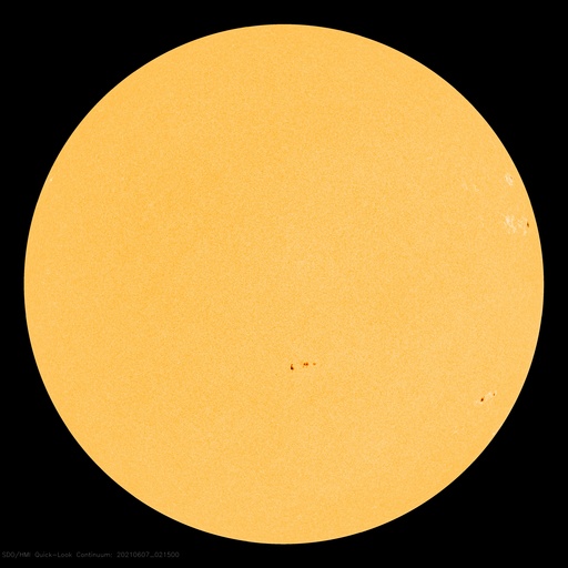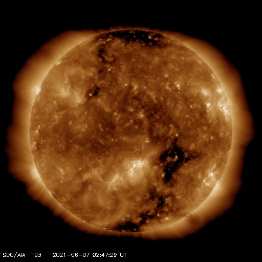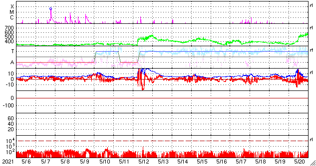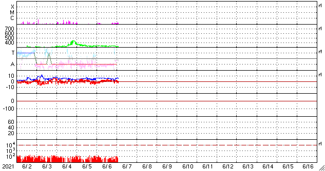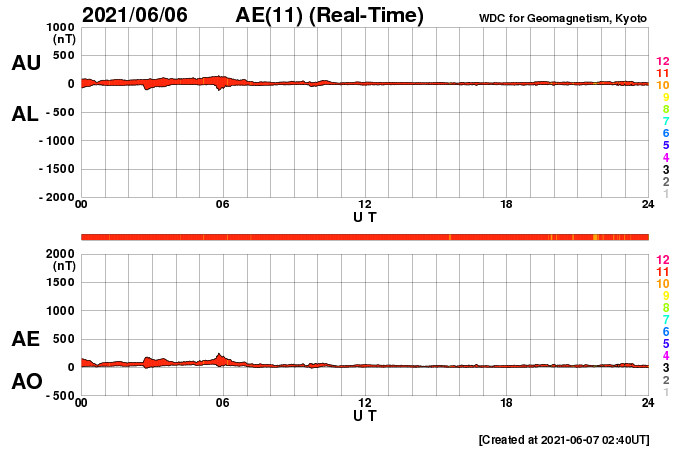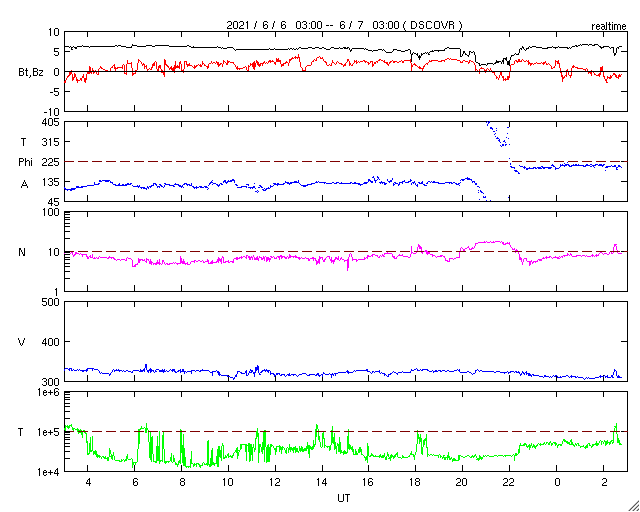 2021/ 6/ 7 11:57 更新 低速の太陽風が続き、磁気圏もとても穏やかです。黒点が増えています。 担当 篠原 太陽風は、330km/秒と低速の風が続き、 グラフの最後では310km/秒へさらに遅くなっています。 磁場強度は、6nT前後と平均的な状態です。 磁場の南北成分は、弱い北寄りになっています。 磁気圏はとても穏やかで、AE指数はほとんど変化がありません。 SDO衛星AIA193では、 南半球のコロナホールは西半球に更に進み、 明日くらいから太陽風速度の高まりが見られるかもしれません。 変化は小規模に留まるのではないかと思います。 太陽は、中心部南側の2829群の黒点が増えています。 南西(右下)に昨日から現れていた黒点に 2830群と番号が付けられています。 また、北西(右上)の2827群の上側に黒点が現れ、 左側の2か所にも非常に小さい黒点が現れている様です。 X線グラフは特に変化はなく、活動は穏やかです。