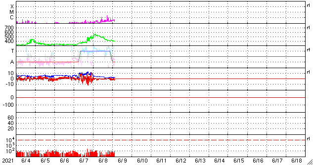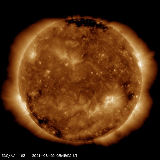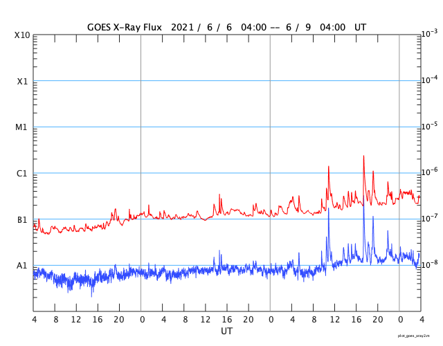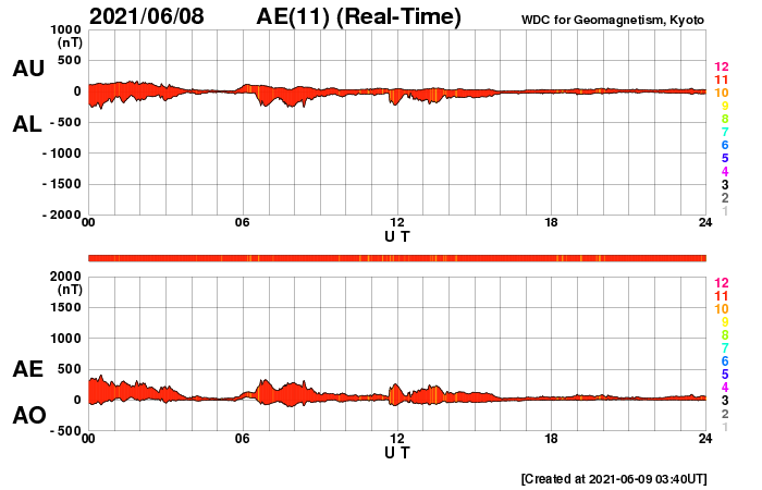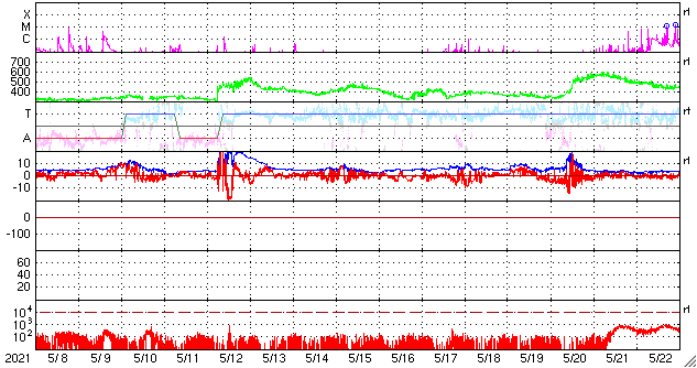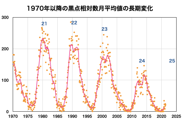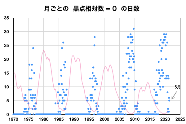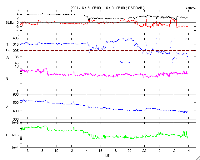 2021/ 6/ 9 13:01 更新 太陽風は平均的な速度に戻っています。5月の黒点相対数は 21.2 でした。 担当 篠原 WDC-SILSOより、 5月の黒点相対数は、21.2 と発表されています。 3月の17.3、4月の24.5と同じくらいの数値で、 安定した変化になっています。 ひとつ前の周期である第24期の始まりの 2010年頃と比較しても、だいたい同じくらいの値です。 無黒点の日は、5日でした。 11年前の2010年を見ると、4月、5月は無黒点の日が12日あり、 この頃までは黒点のない日も目立っていた様です。 一方、6月以降は4日以下の月が続いて、 2011年に入ると無黒点の日はほとんどなくなっています。 今期はどうなるでしょうか。 その太陽は、黒点群たちが西の端に沈み、 現在は2829群だけになっています。 南東の端(左下)からは活動的な領域が上がってきましたが、 今のところ白斑が見えるだけです。 X線グラフではCクラスの小規模フレアが3回発生していますが、 西の端に沈んで行った2831黒点群で発生しています。 この後は穏やかになりそうです。 太陽風は、昨日のニュース以降は速度が次第に低下して、 既に390km/秒と平均的な状態に戻っています。 磁場強度は4nTから2nTへ下がり、弱くなっています。 磁気圏の活動も次第に弱くなっていて、 グラフの後半はほとんど変化がなくなっています。 SDO衛星AIA193を見ると、 太陽の中心部にコロナホールはなく、 太陽風は低速風になりそうです。 一方、南東の端(左下)からコロナホールが現れています。 次の太陽風の高まりは、この領域の影響になりそうです。 ![]() 太陽黒点相対数の長期変化。5月の黒点相対数は 21.2 でした。 (c) 黒点データ:WDC-SILSO、作図:宇宙天気ニュース ![]() 1970年以降の太陽黒点相対数の長期変化。 (c) 黒点データ:WDC-SILSO、作図:宇宙天気ニュース ![]() 1970年以降の月毎の無黒点日の日数。 (c) 黒点データ:WDC-SILSO、作図:宇宙天気ニュース ![]() SDO衛星のAIA193カメラによる太陽コロナの様子 (c) SDO (NASA) ![]() SDO衛星による太陽の可視光写真。マウスの矢印を写真に重ねると、黒点番号付きの写真に切り替わります。 (c) SDO (NASA) ![]() GOES衛星の太陽X線強度。赤・橙 = 0.1〜0.8 nm、青・紫 = 0.05〜0.4 nm (c) データ:NOAA/SWPC、作図:宇宙天気ニュース ![]() DSCOVRが観測した太陽風の磁場(1番上の枠、黒線は全体の強度、赤線は南北成分) および、太陽風の密度(3番目の紫線)、速度(4番目の青線) (c) データ:NOAA/SWPC、作図:宇宙天気ニュース ![]() AE指数(速報値) 下段のAEグラフの値が高くなると、オーロラ活動が活発化しています。 (c) 京都大学WDC ![]() ![]() 27日の太陽周期に合わせたデータプロット 太陽が同じ面を地球に向けていた27日前の変化から、今後を予想することができます。 (c) 作図:宇宙天気ニュース