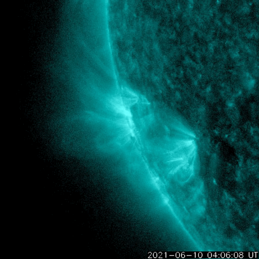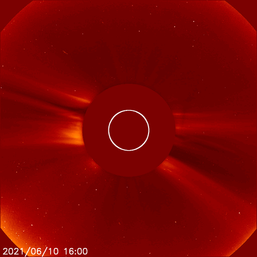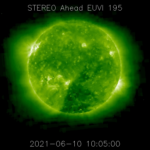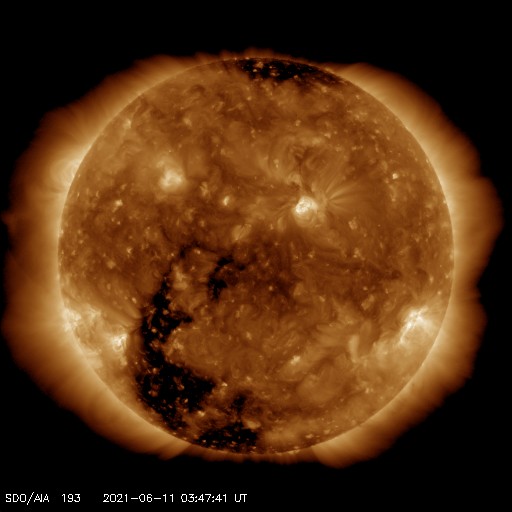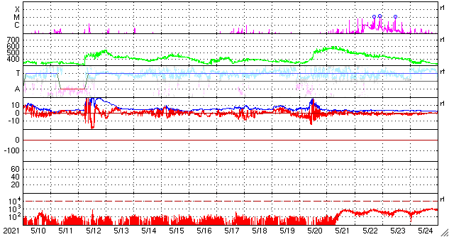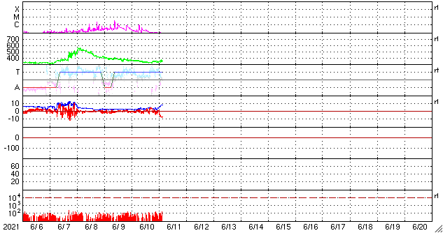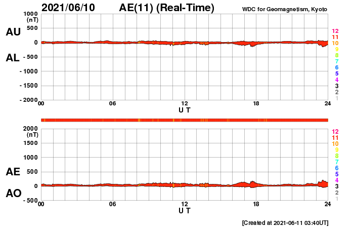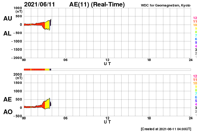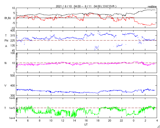 2021/ 6/11 12:57 更新 太陽風の磁場が南向きに振れて、磁気圏の活動を高めそうです。 担当 篠原 太陽風は、360km/秒から320km/秒へ速度が下がり、 再び350km/秒へ上がる小幅の変化をしています。 低速の状態が続いています。 磁場強度は、3nT前後とやや弱い状態が続いていましたが、 グラフの最後で8nTへやや強まる変化が発生しています。 磁場の南北成分も南向きに強まり始め、 -8nTに達する変化になっています。 速度が下がっているので影響は限定的になりそうですが、 磁気圏の活動はこれからある程度高まりそうです。 AE指数には変化が現れ始めています。 注目してください。 SDO衛星AIA193では、 南東(左下)のコロナホールが目立っています。 5〜6日後から太陽風が強まりそうです。 太陽では、南東の端(左下)で、 昨日、10日15時(世界時10日6時)に、 C1.1の小規模フレアが発生しています。 SDO衛星AIA131、193による動画を掲載します。 また、太陽の左斜めから観測している STEREO Ahead衛星によると、 太陽の北東の端の向こう側で、 ある程度の規模のフレアが発生した様です。 EUVI 195による動画を掲載します。 このフレアに伴ってCME(コロナ質量放出)も発生していて、 SOHO衛星LASCO C2では 太陽の左に向かってガスが飛び出す様子が観測されています。 この領域が太陽のこちら側に回ってくる頃は、 どの様な活動になっているでしょうか。
