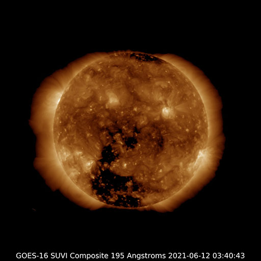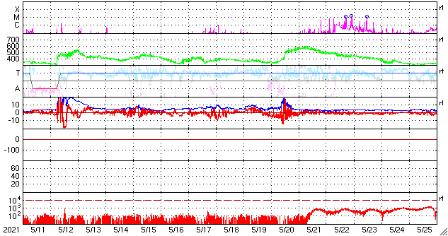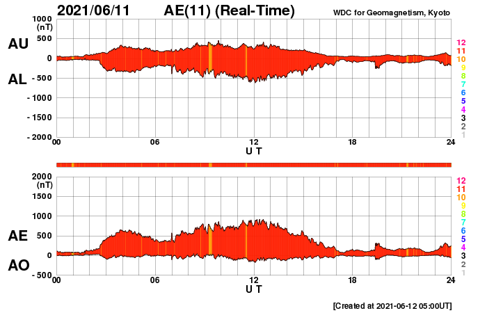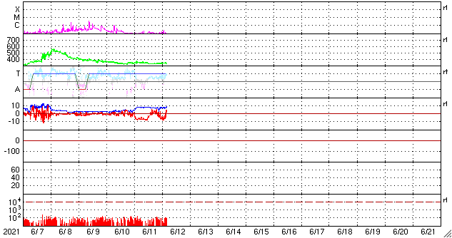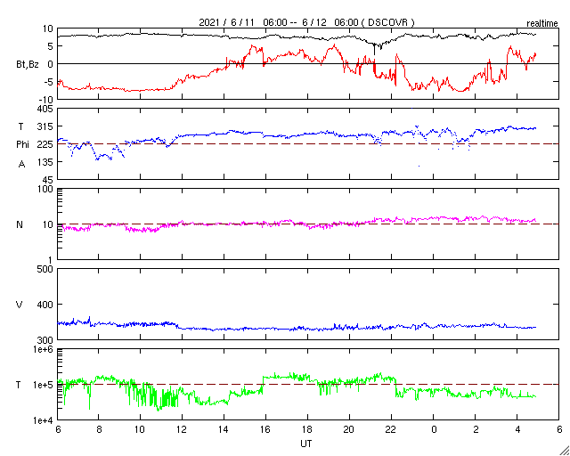 2021/ 6/12 14:03 更新 太陽風磁場の南向きが続き、磁気圏の活動が高まっています。 担当 篠原 太陽風は、磁場強度が8nTとやや強まった状態が続いています。 速度は、350km/秒から330km/秒へ少し下がり、 低速の状態が続いています。 磁場の南北成分は、 昨日の夜にかけて -7nTと南向きに強まった状態が続き、 その後、今日未明にかけて北寄りに変化しましたが、 再び南向きに切り替わり、 グラフの最後はまた北寄りに変わりかけています。 磁場の南向きの変化により磁気圏の活動は高まって、 AE指数は500〜900nTの中規模の変化が連続的に発生しています。 グラフの最後に1000nTに達する変化も起きていますが、 太陽風の磁場がこのまま北寄りになれば、 磁気圏は穏やかになるでしょう。 今日から明日にかけてSDO衛星のWebページが閲覧できない様で、 太陽コロナ写真は、GOES衛星の画像を掲載しています。 南半球のコロナホールは太陽の中心線に達していて、 3〜4日後くらいから太陽風速度の高まりが始まるかもしれません。 太陽の可視光写真は、12日0時(世界時11日15時)の画像です。 SDO衛星の写真では、 中心部の北西寄り(右上)の2832黒点群と、 南西(右下)の2829群の小さい黒点が見えています。 X線グラフは小さい変化が見られる程度で、 太陽は穏やかです。