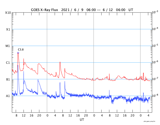 GOES衛星の太陽X線強度。赤・橙 = 0.1〜0.8 nm、青・紫 = 0.05〜0.4 nm (c) データ:NOAA/SWPC、作図:宇宙天気ニュース ![]() | ||||||||||||||||||||||||||||||||||||||||||||||||||||||||||||||||||||||||||||||||||||||||||||||||||||||||||||||||||||||||||||||||||||||||||||||||||||||||||||||||||||||||||||||||||||||||||||||||||||||||||||